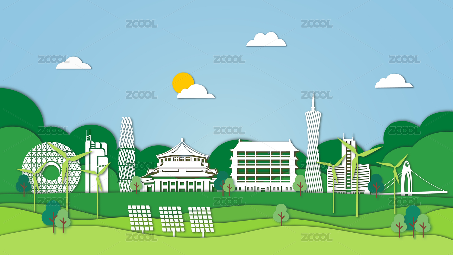 广州新能源绿色城市剪纸风插画