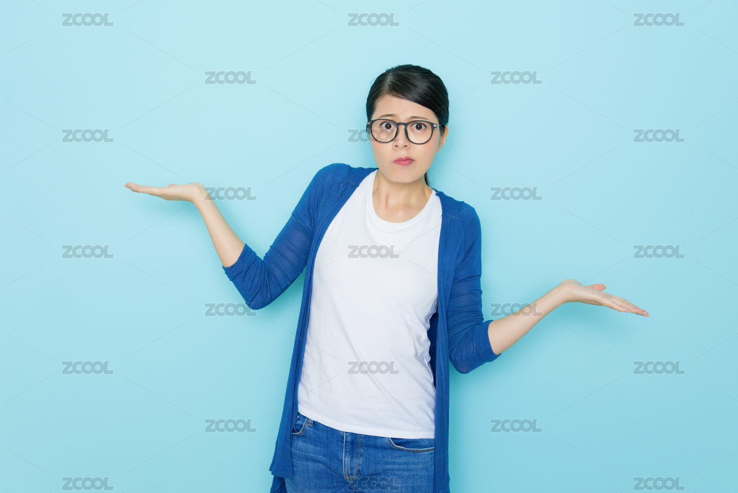 不幸的青年女子呈现冒充选择站在蓝色背景墙上,看着相机出迷惑情绪的脸。