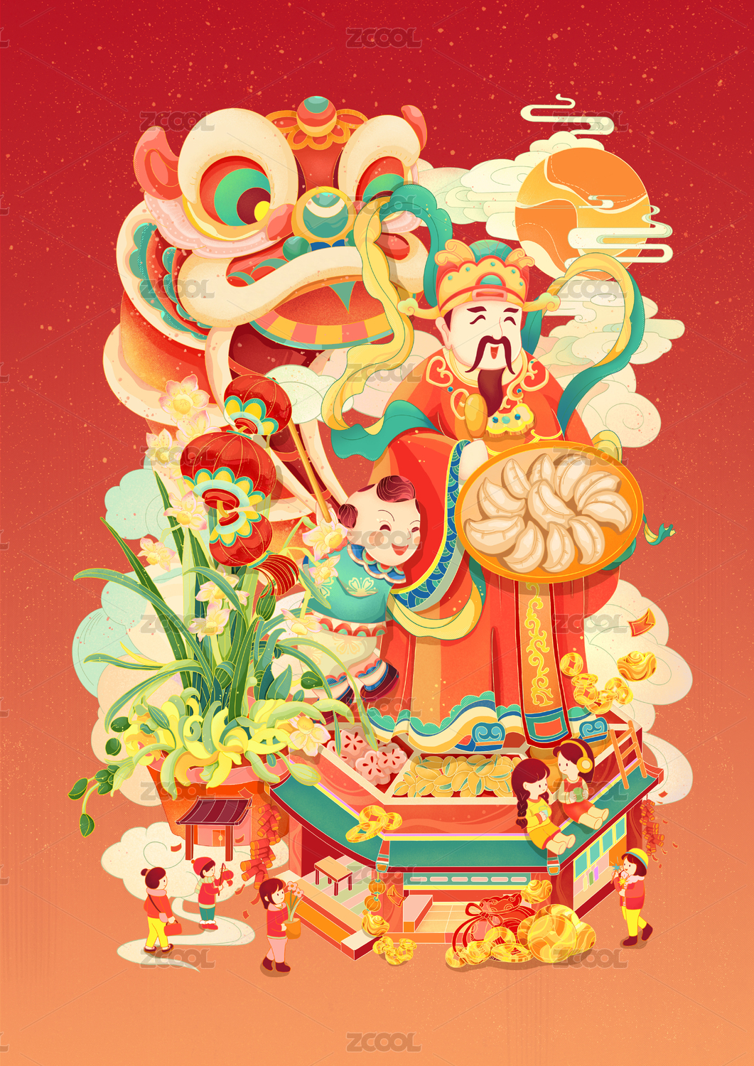 2025恭贺新春灶神过年舞狮国潮插画