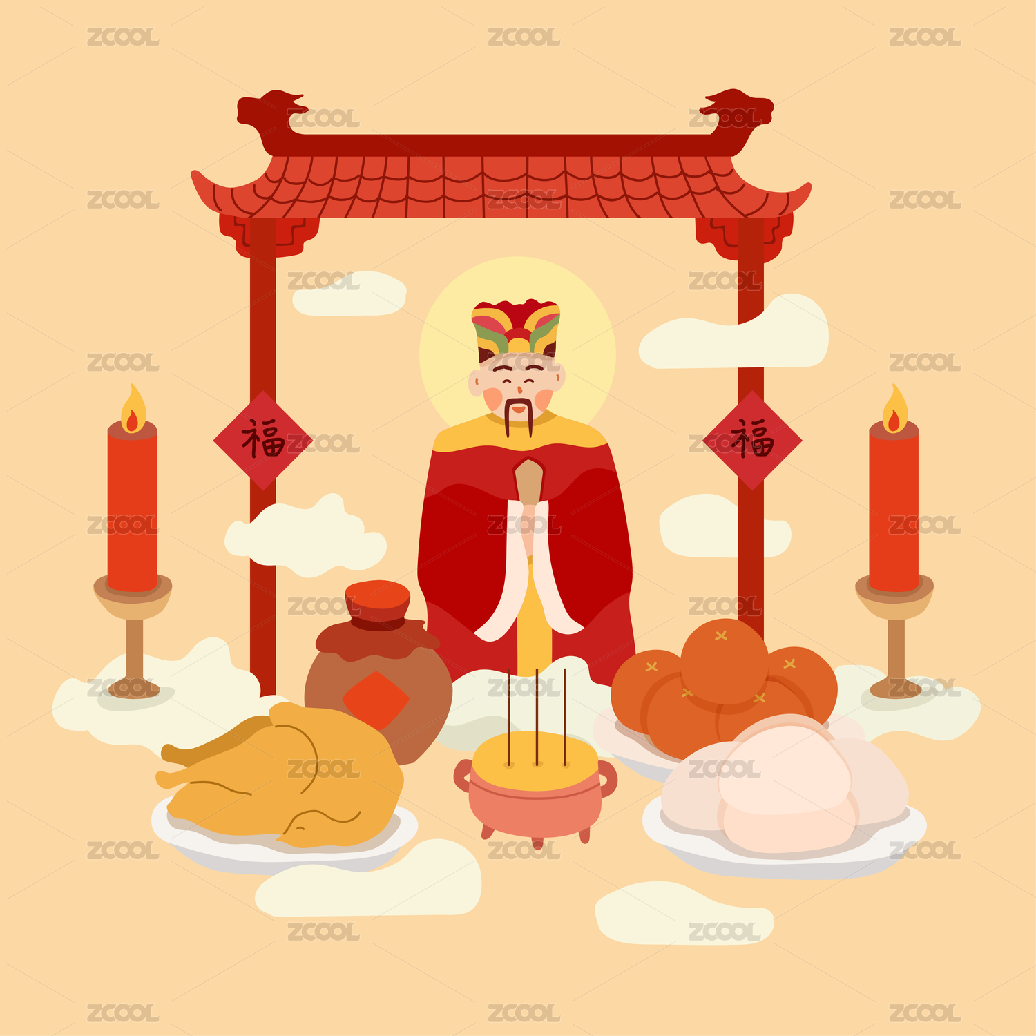 春节灶神美食矢量插画