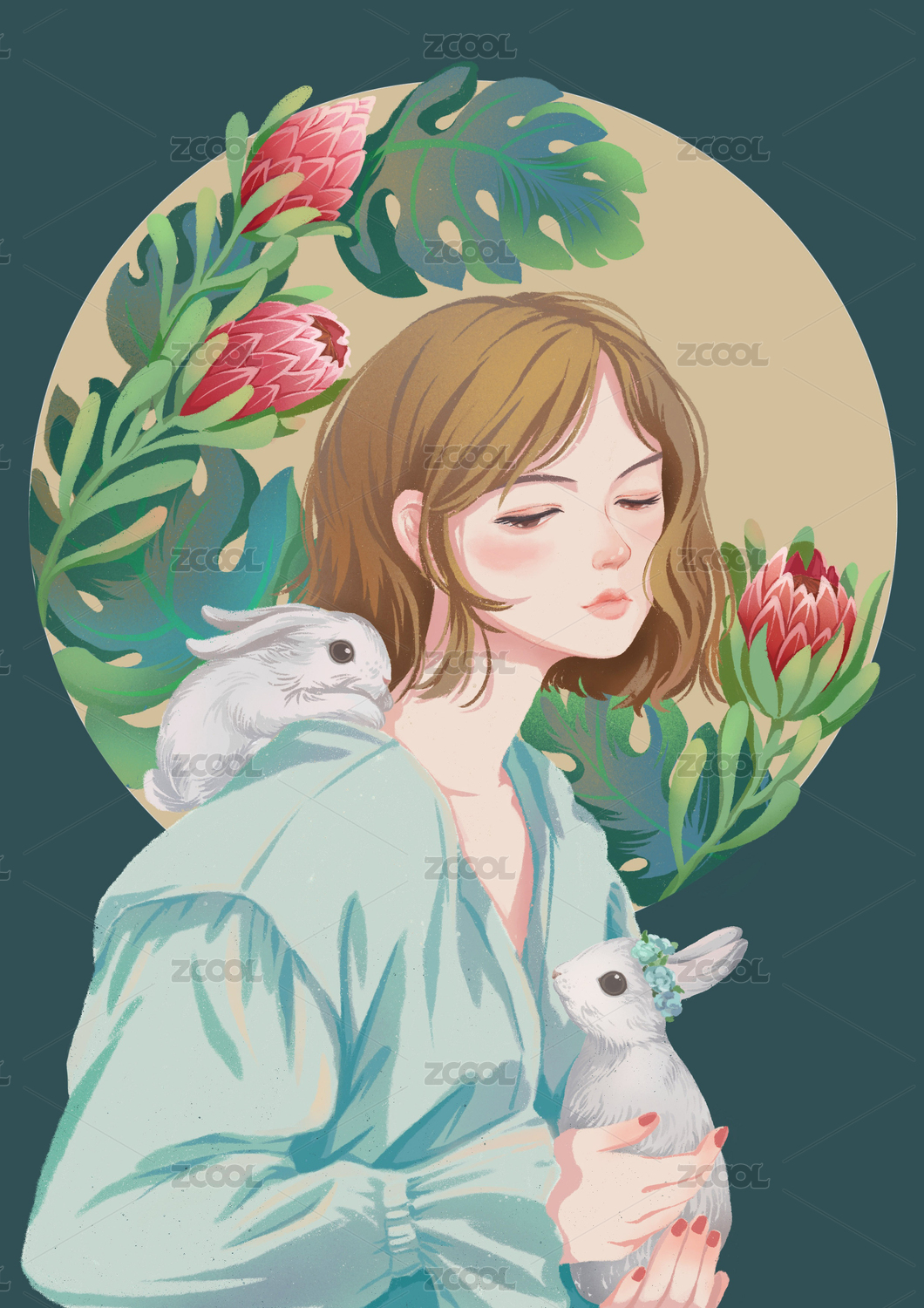 少女花朵与兔子时尚插画
