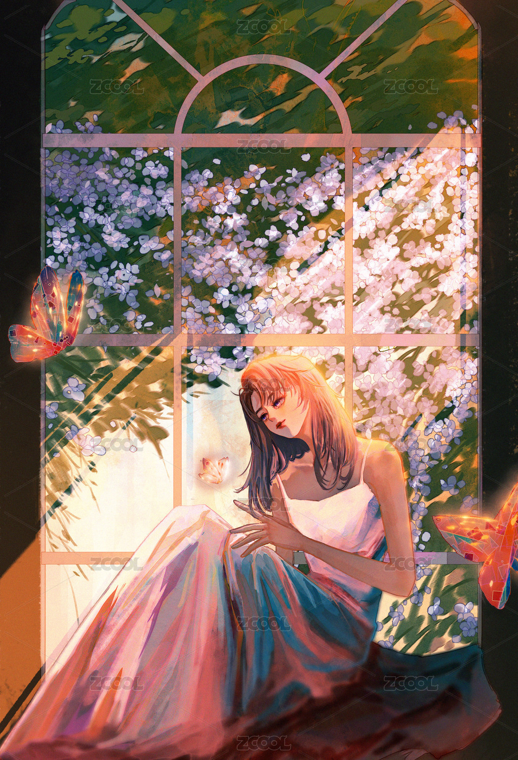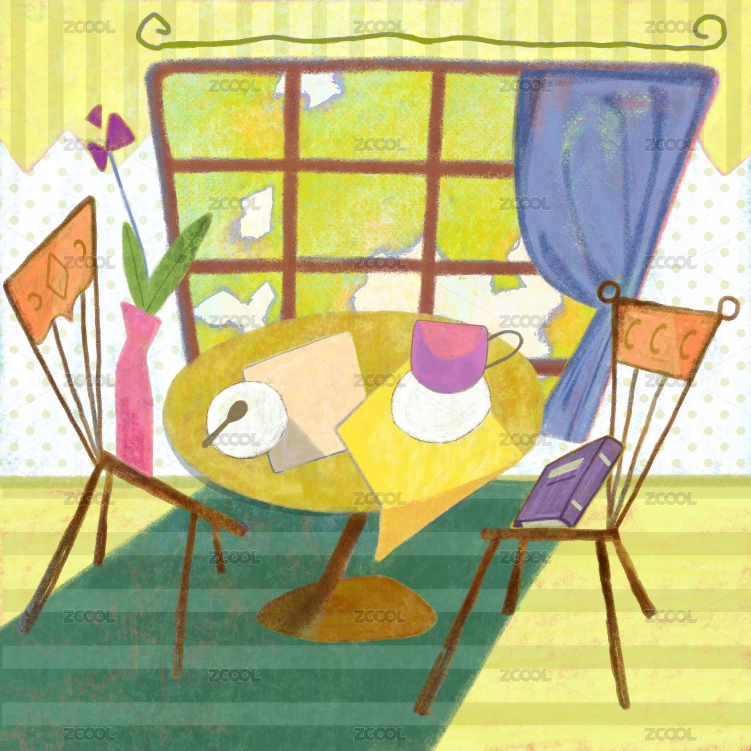窗户外景花草时尚插画艺术插画