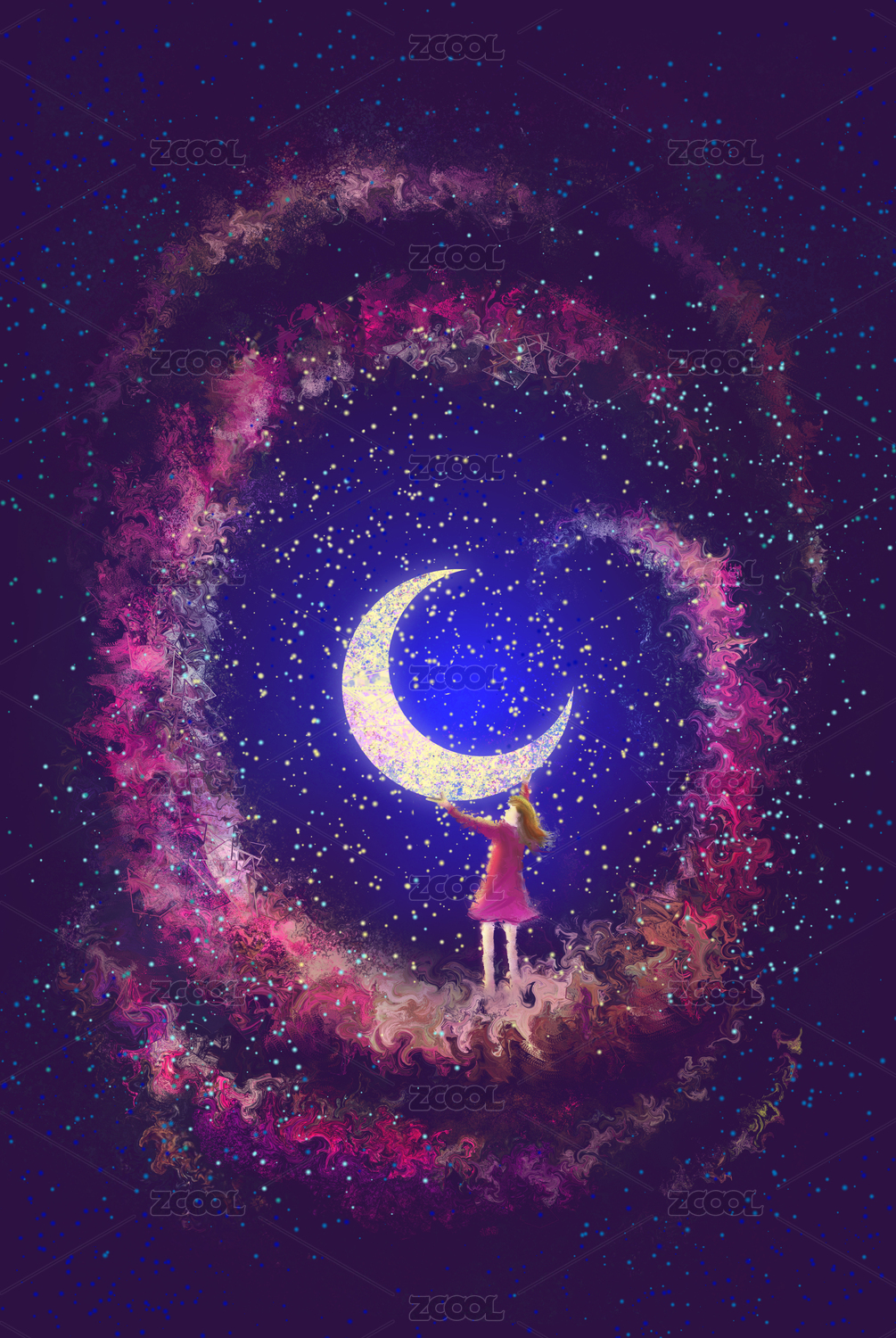 在星云中托起月亮的女孩插画