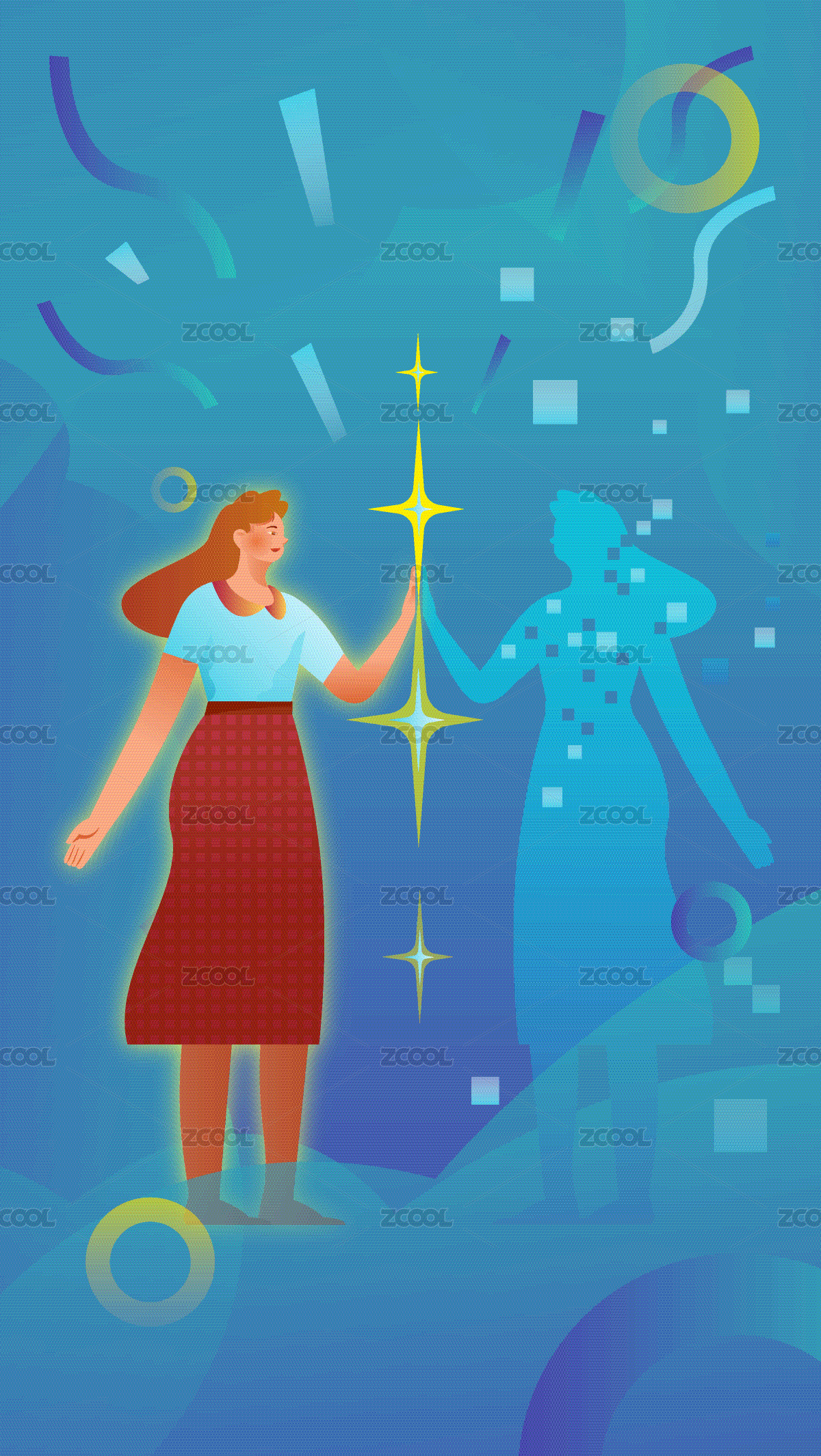 女人在科技之光中触摸自己的数字人
