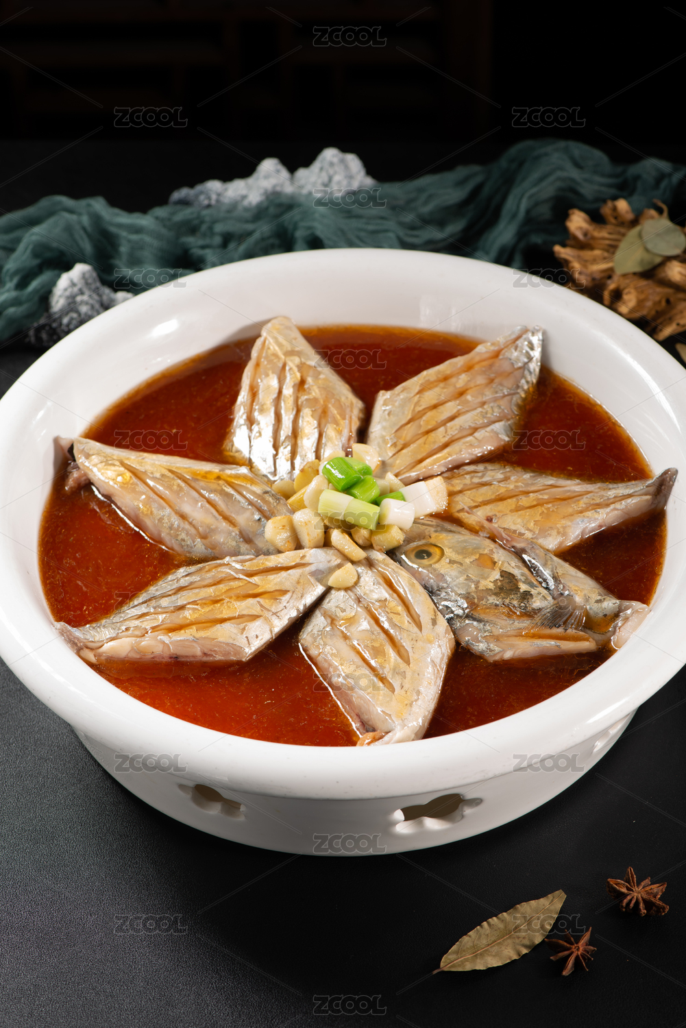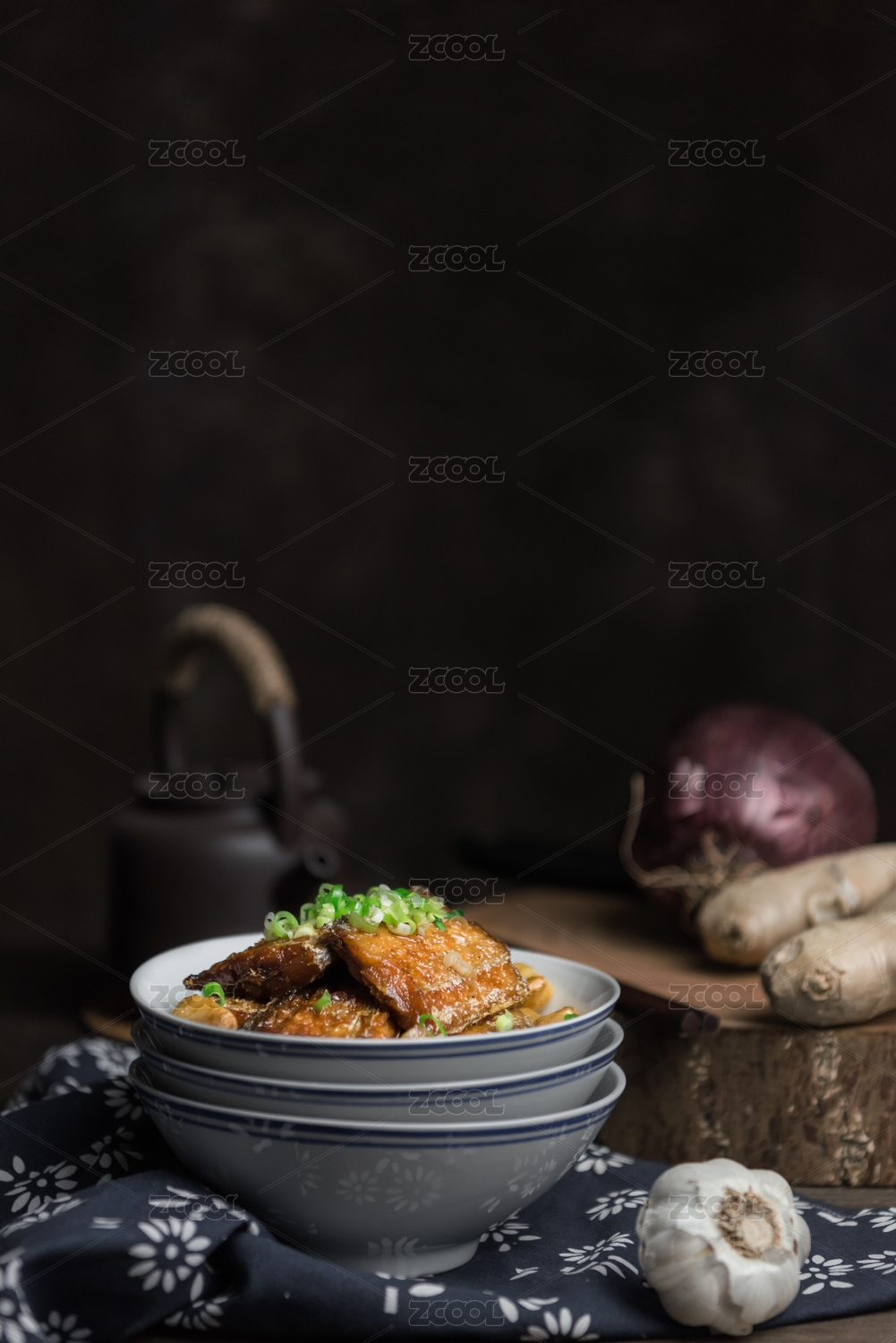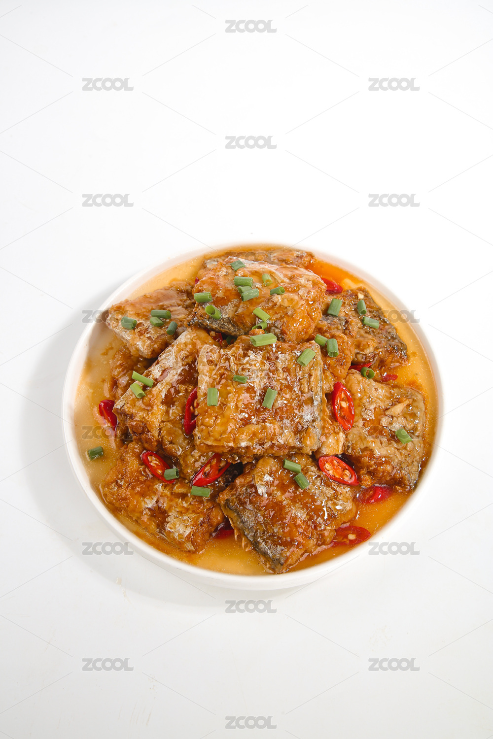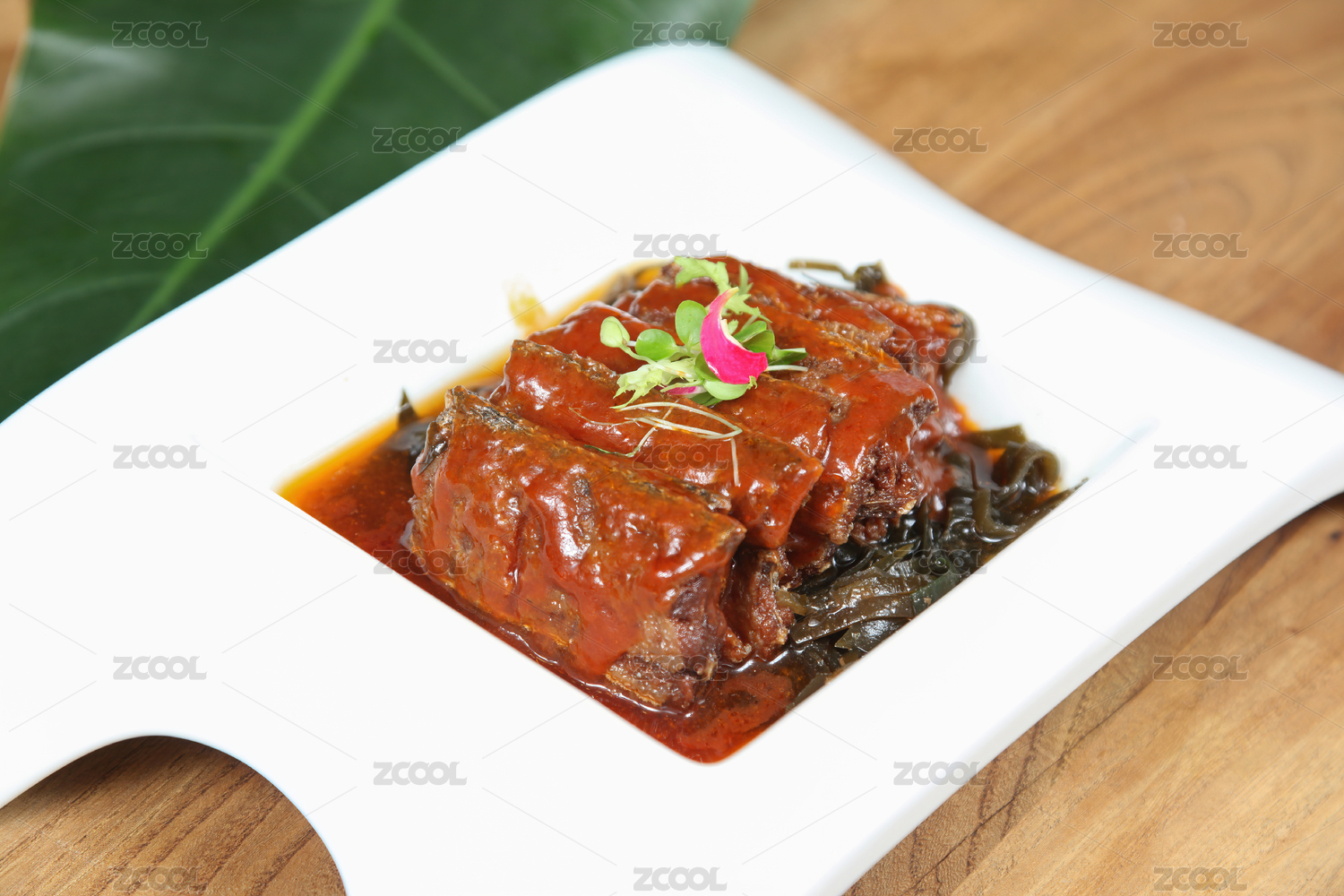 长方形瓷盘装的红烧带鱼段摆放在樟木砧板上