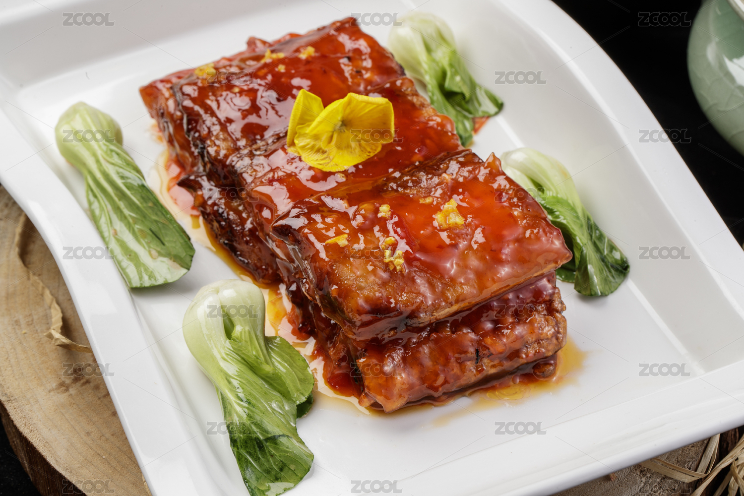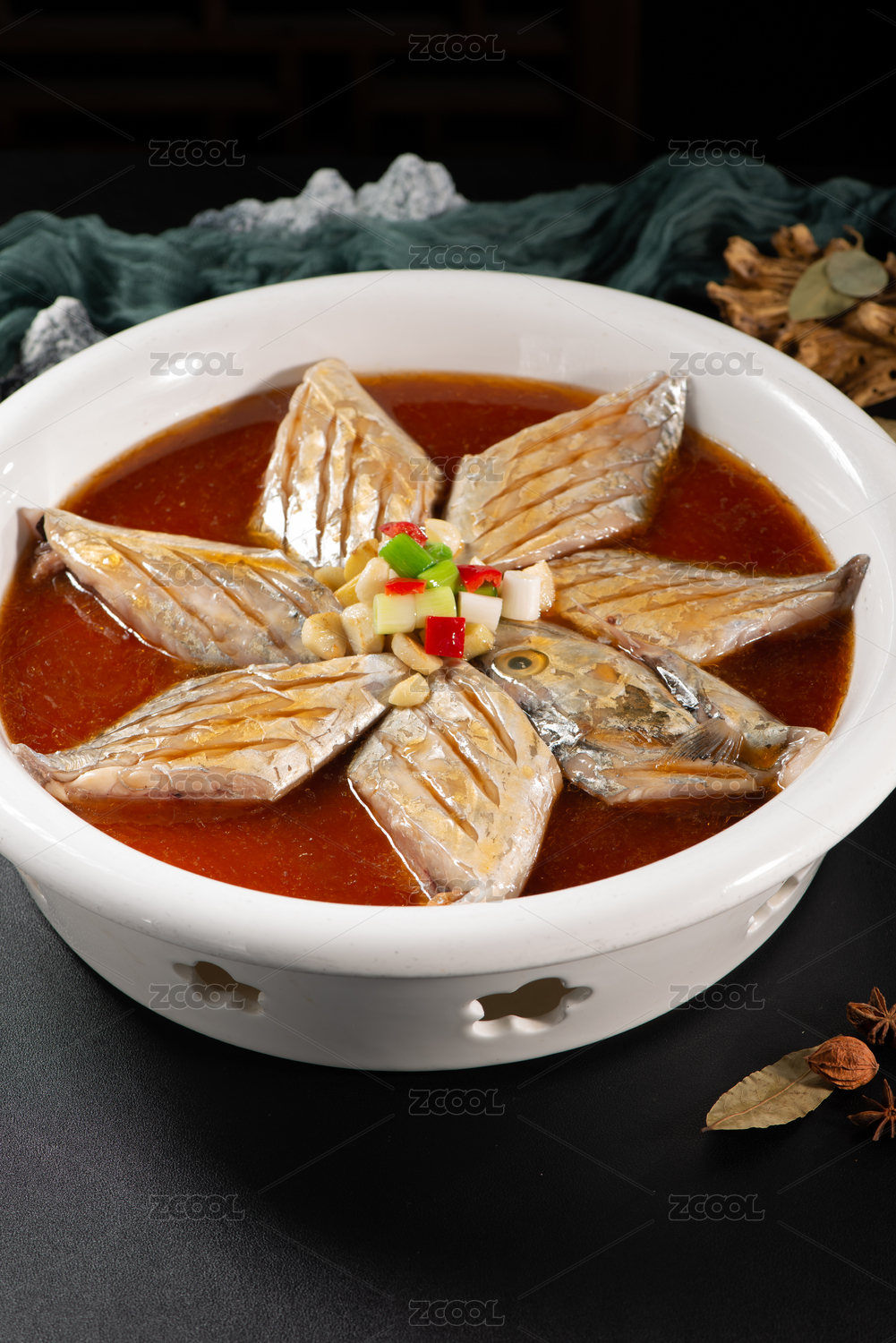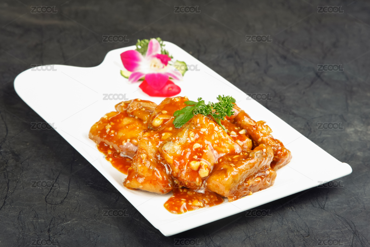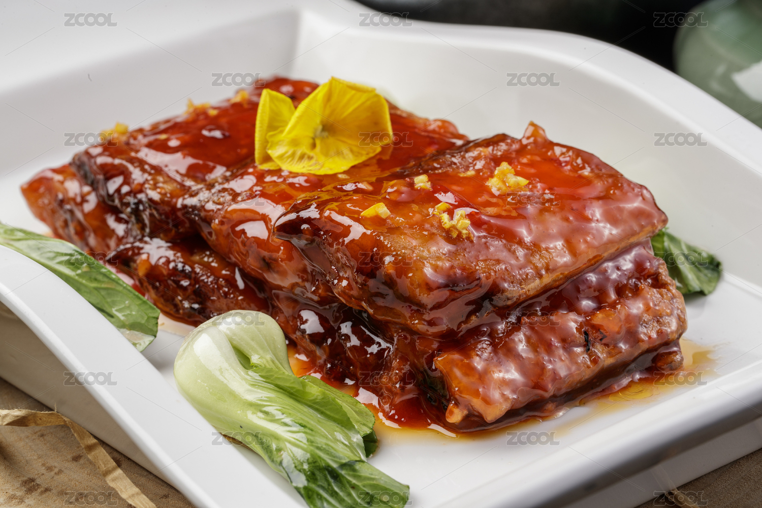 长方形瓷盘装的红烧带鱼段摆放在樟木砧板上