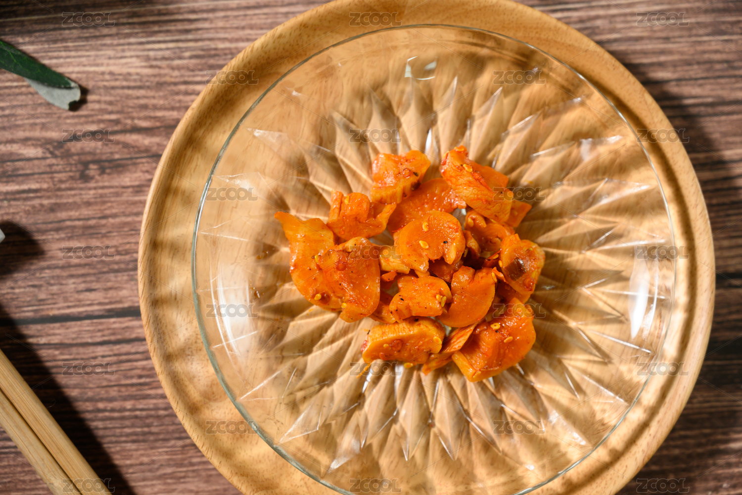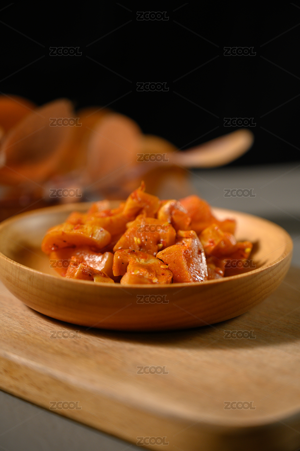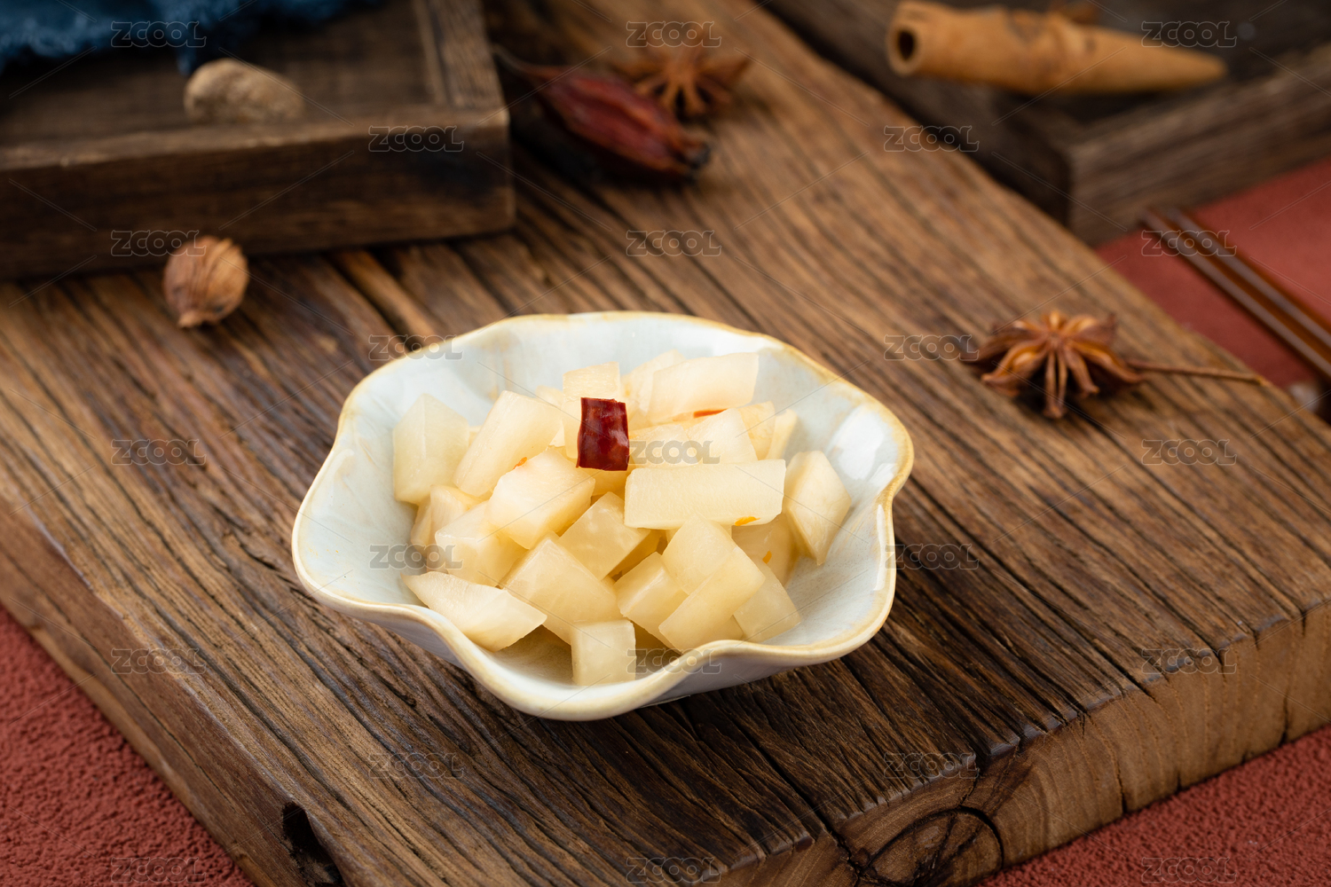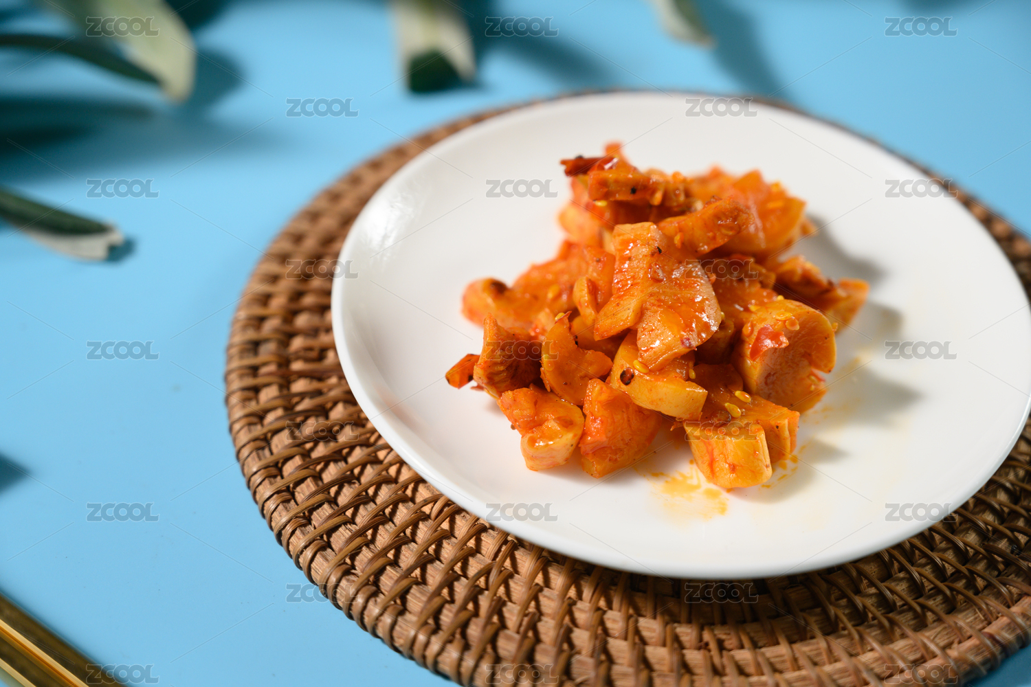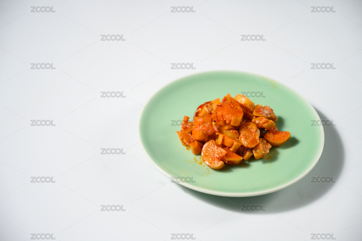 桌面上的盘子里的美味可口的香辣萝卜丁