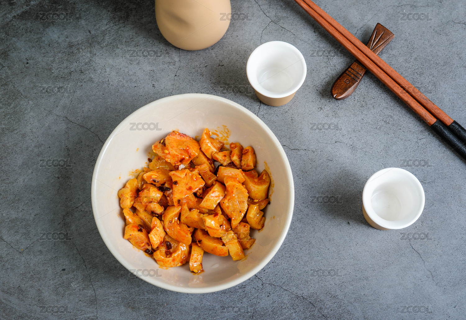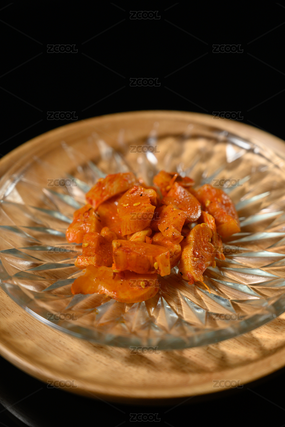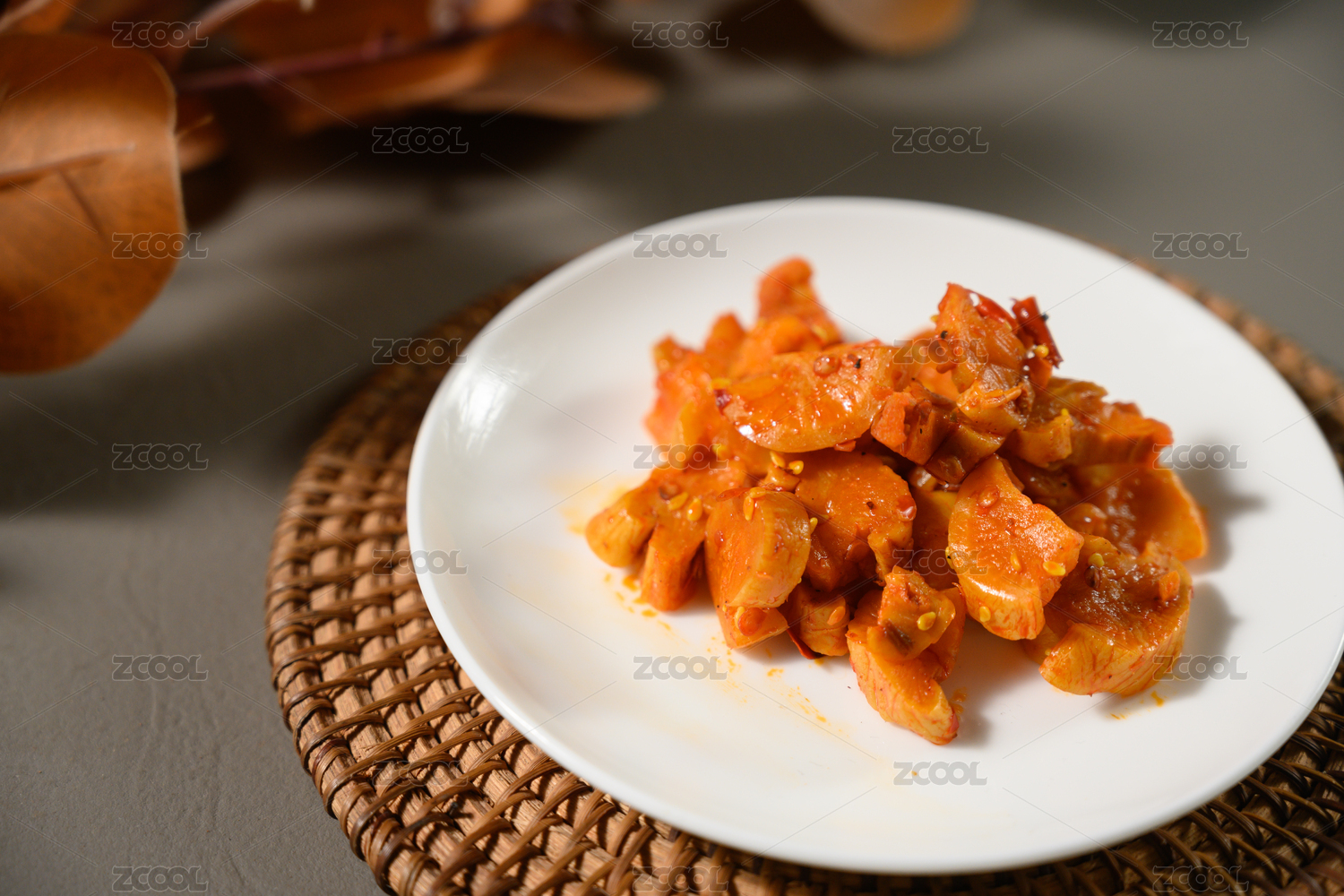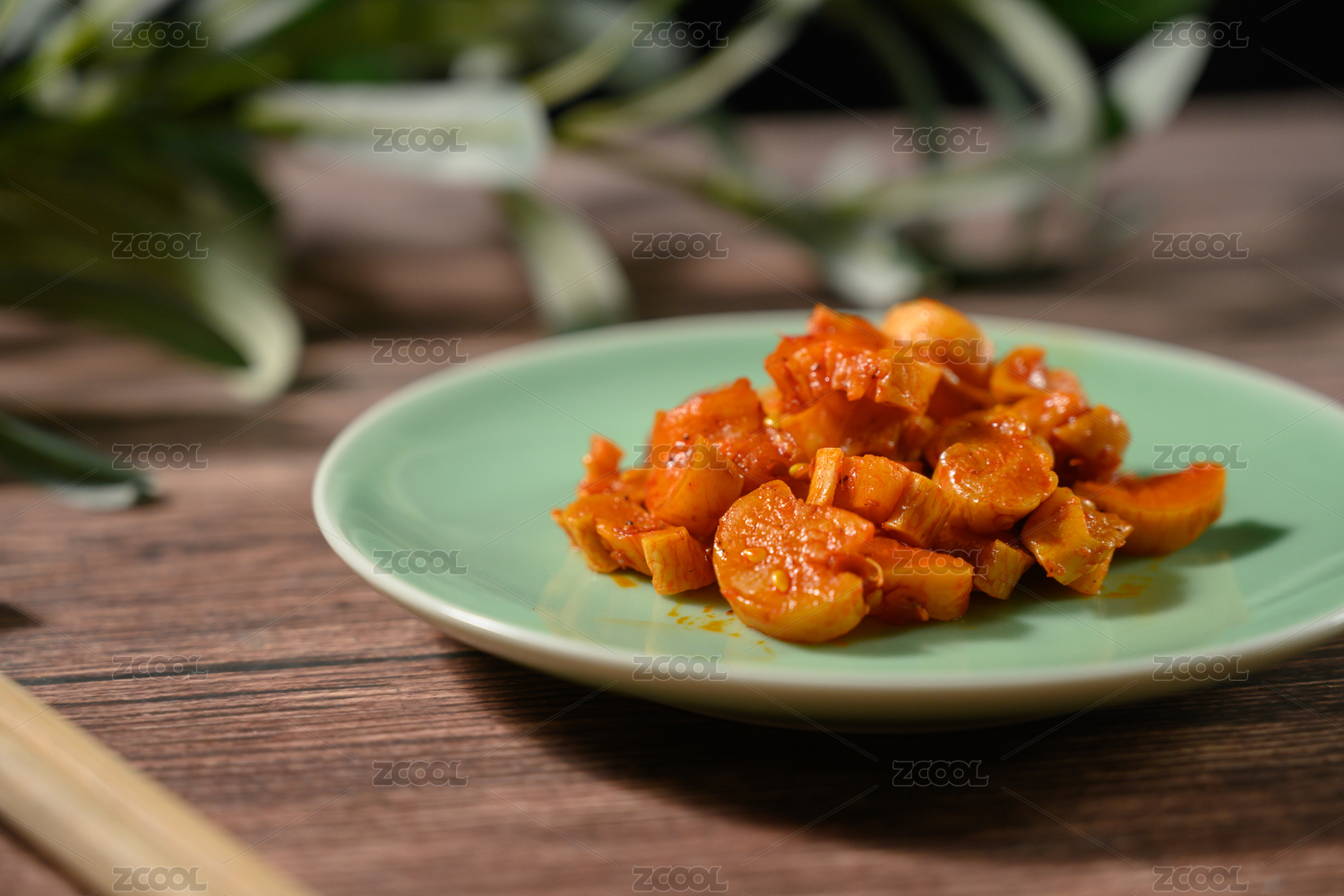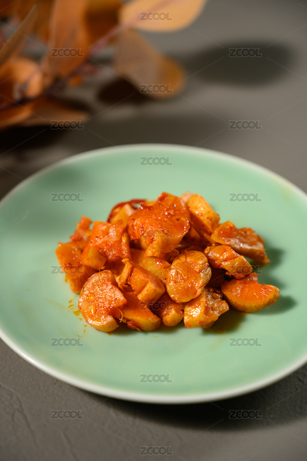桌面上的盘子里的美味可口的香辣萝卜丁