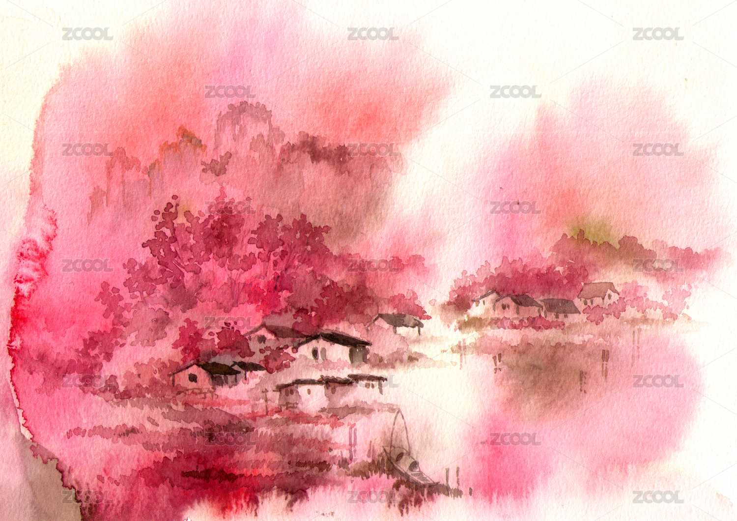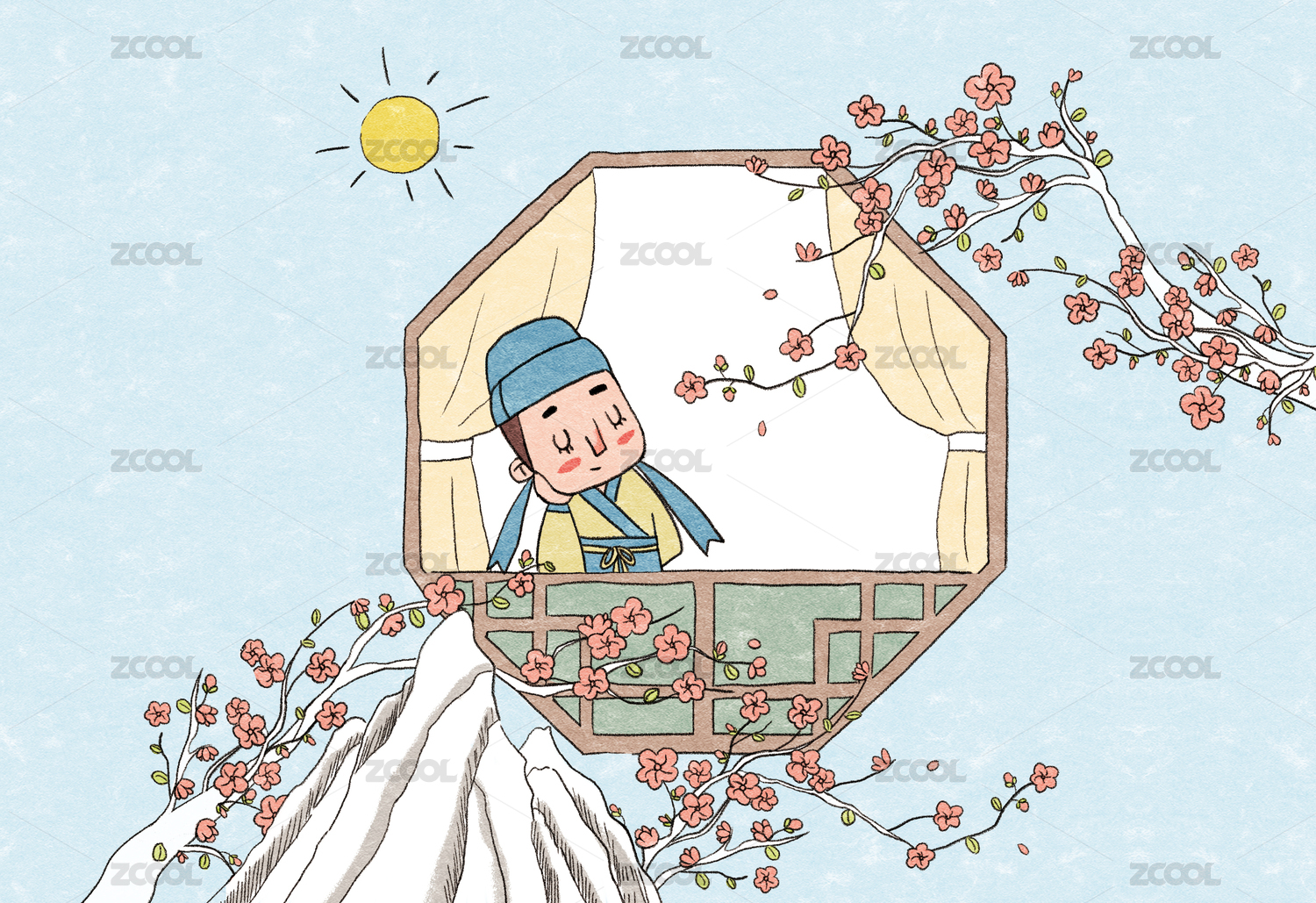 中国风古诗春晓插画,春天鸟儿飞舞风吹拂花朵
