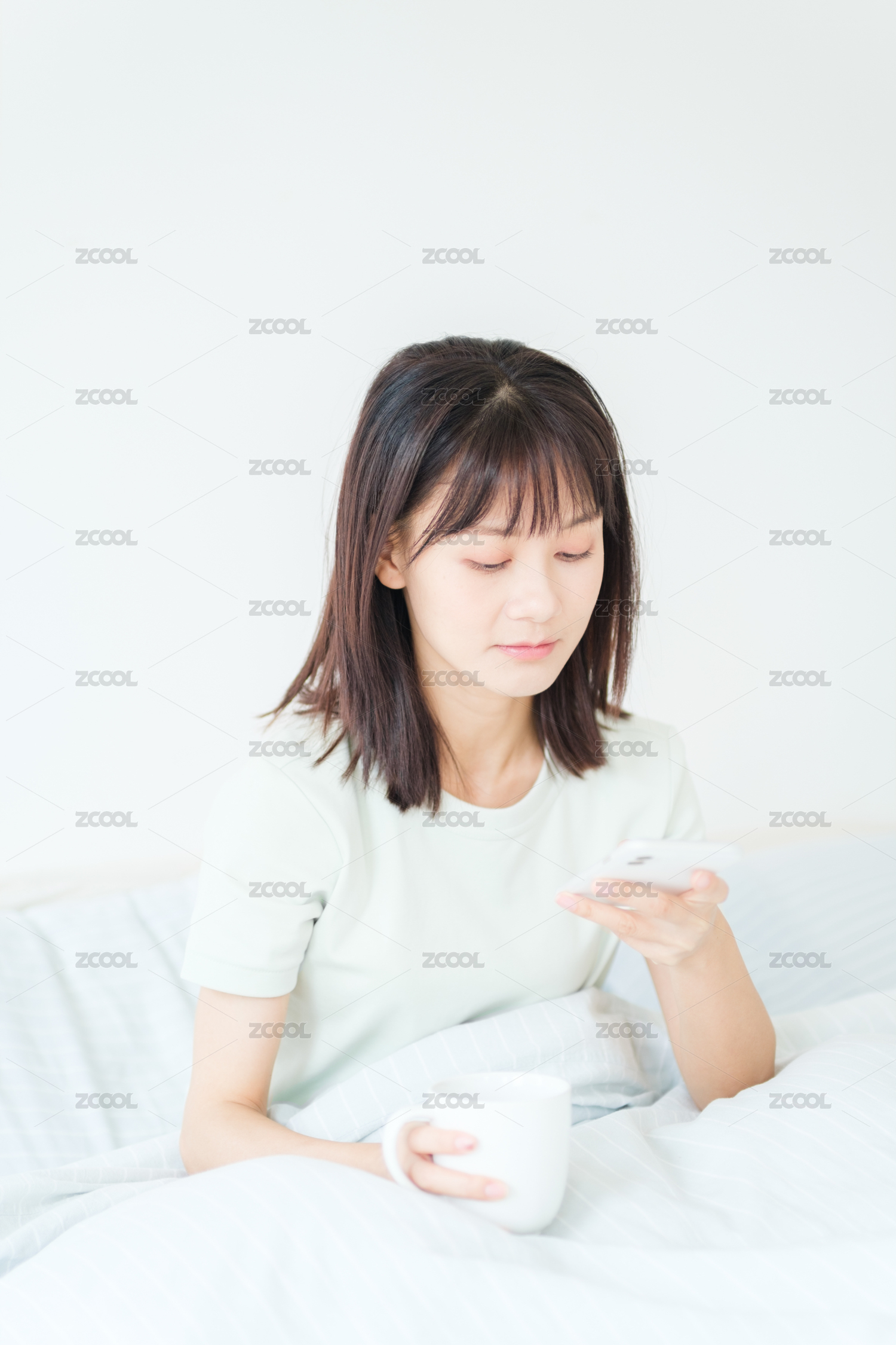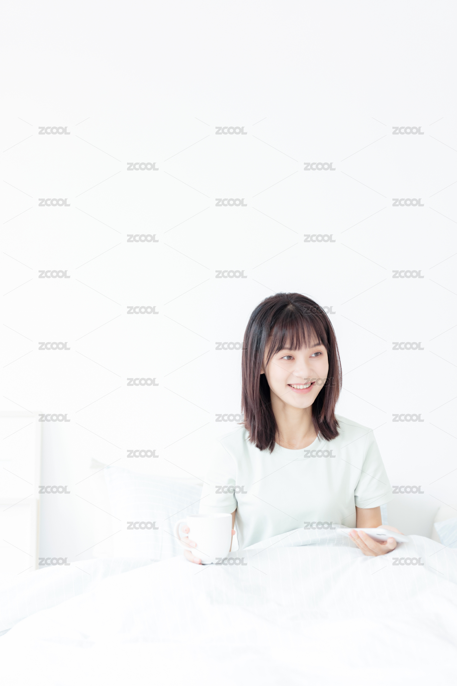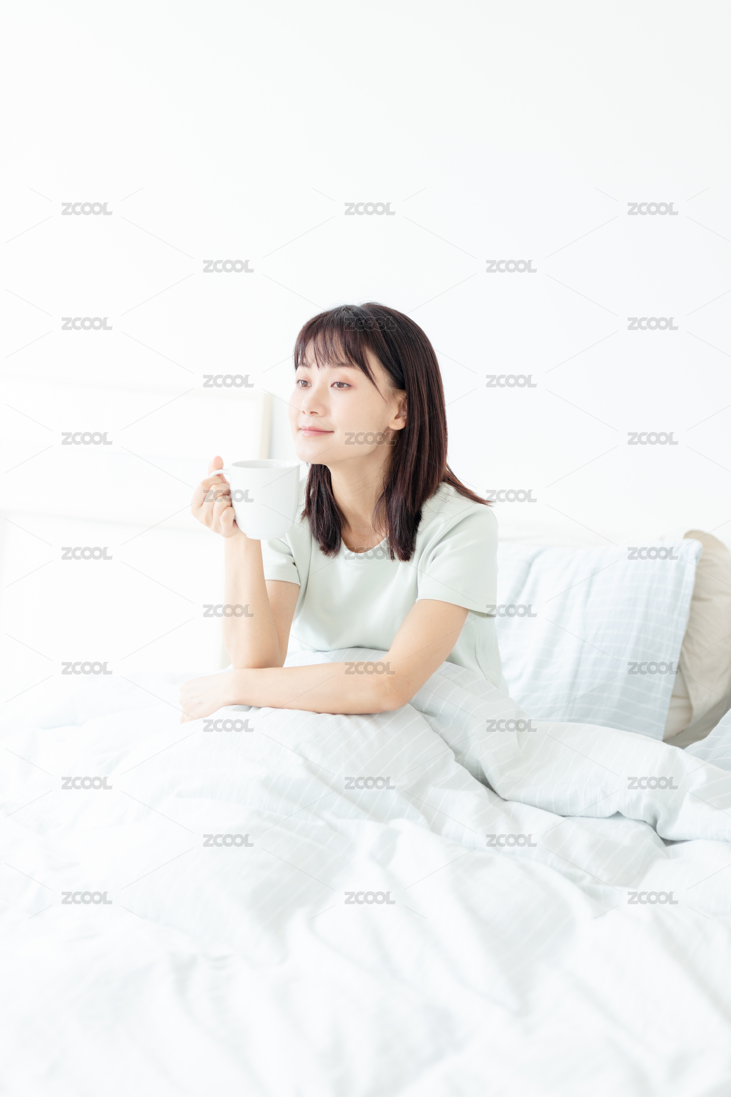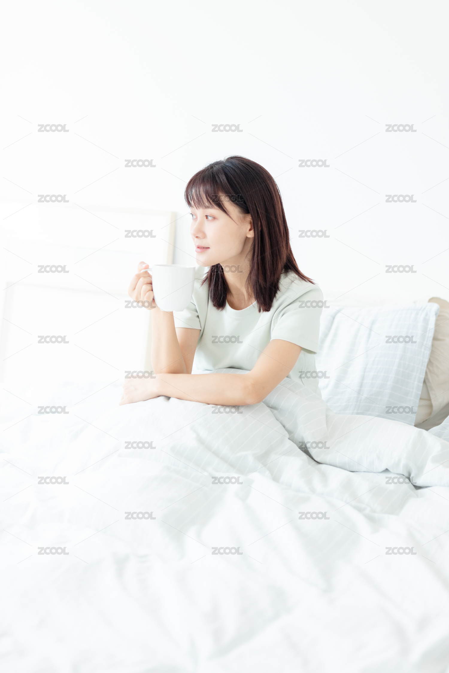 早起坐在床上的年轻女性