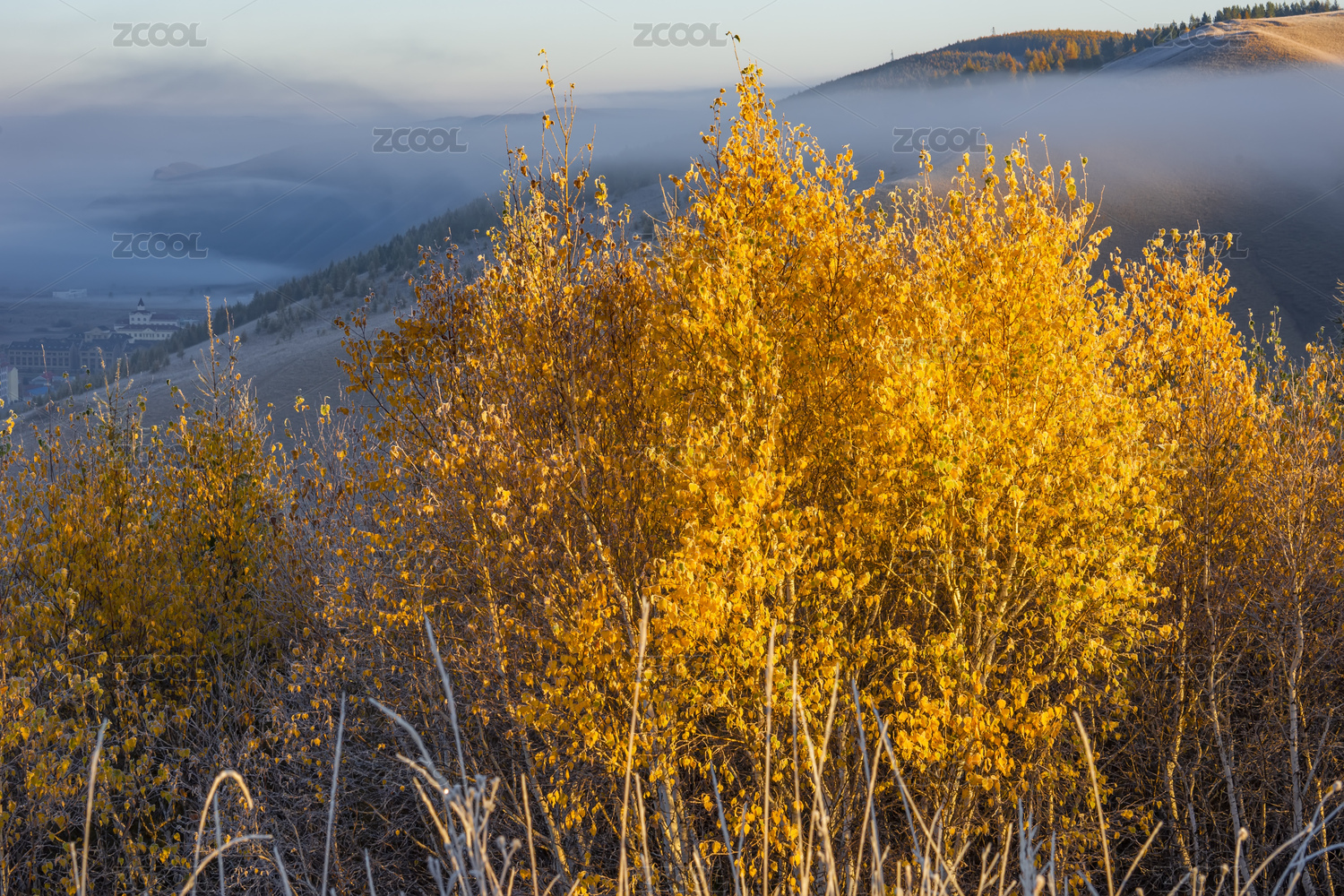 中国内蒙古阿尔山市山区深秋早起云雾雾凇