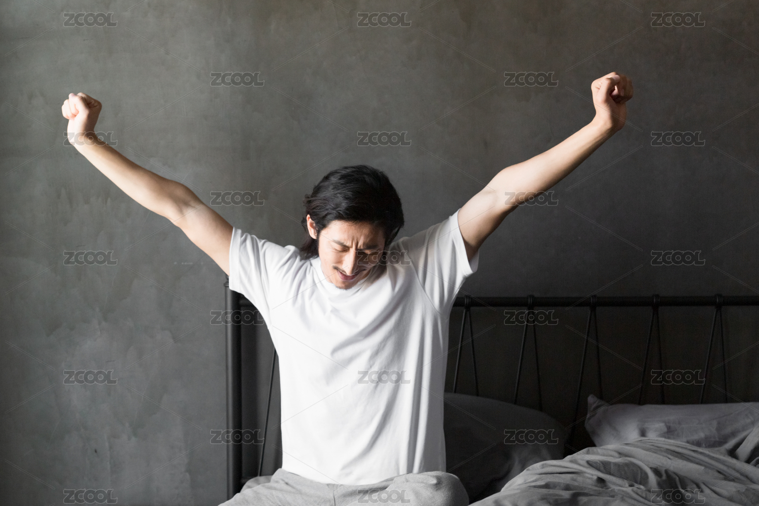 年轻女性早起在卧室舒展身体