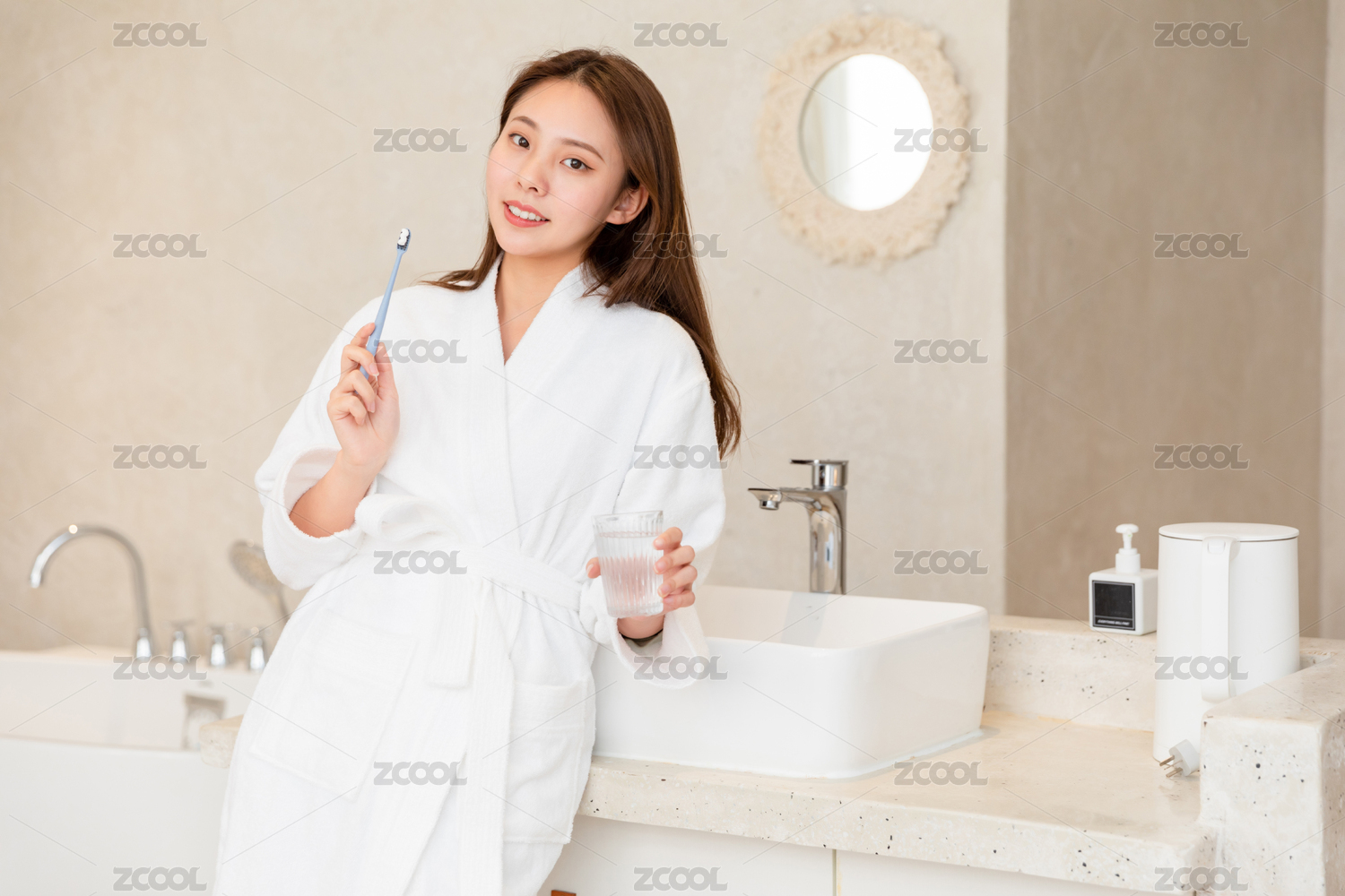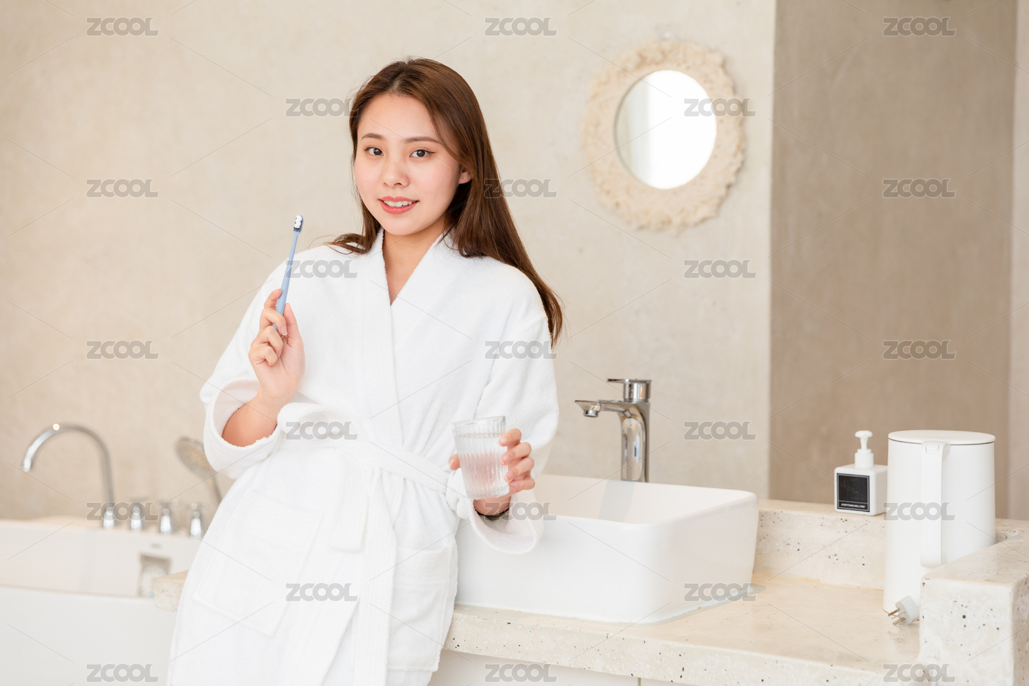 居家女性早起穿着浴袍刷牙洗漱