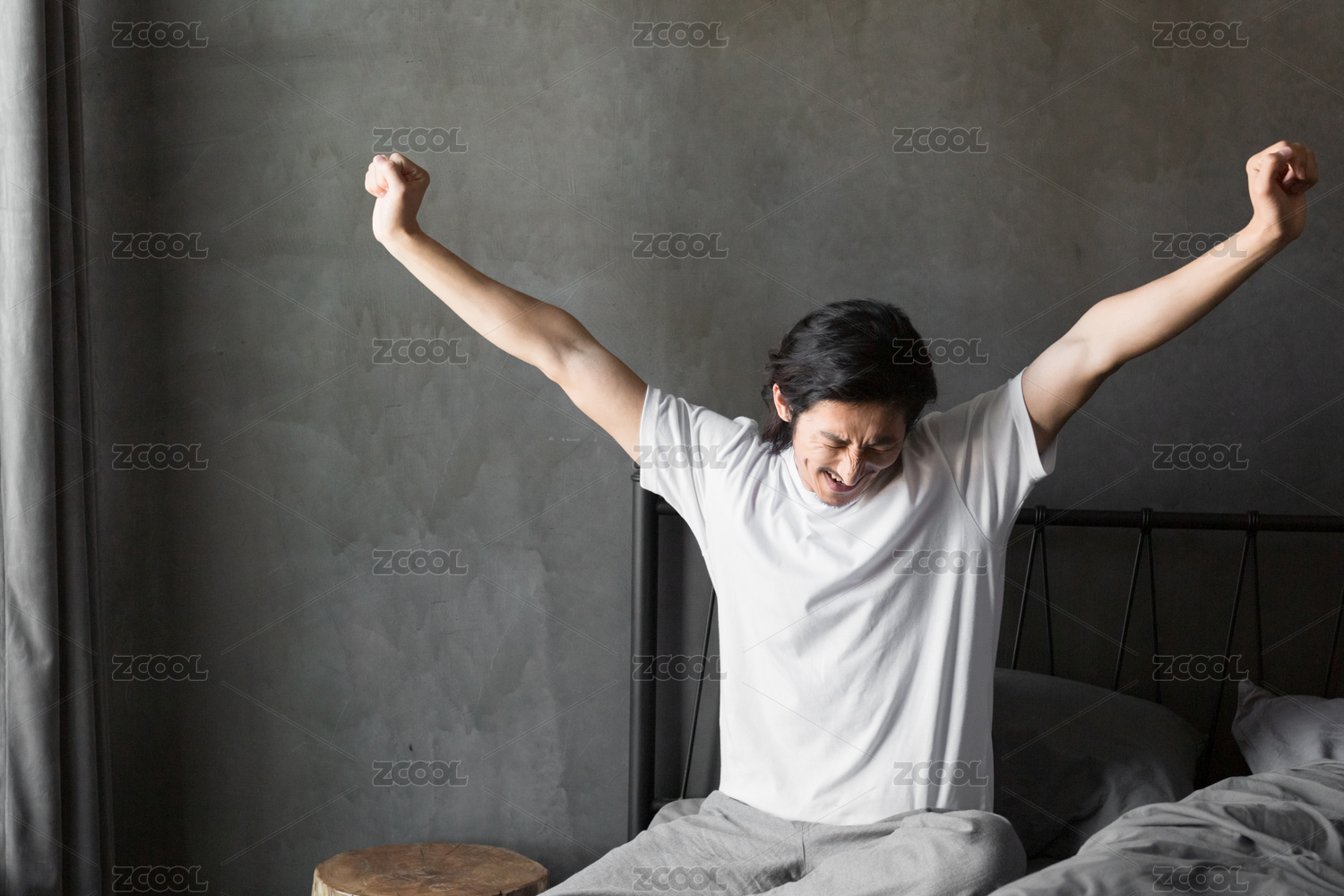 年轻女性早上起床站在窗前向上伸出手