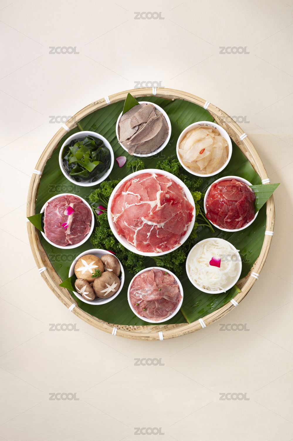 簸箕里的重庆火锅汤锅菜品牛肉拼盘