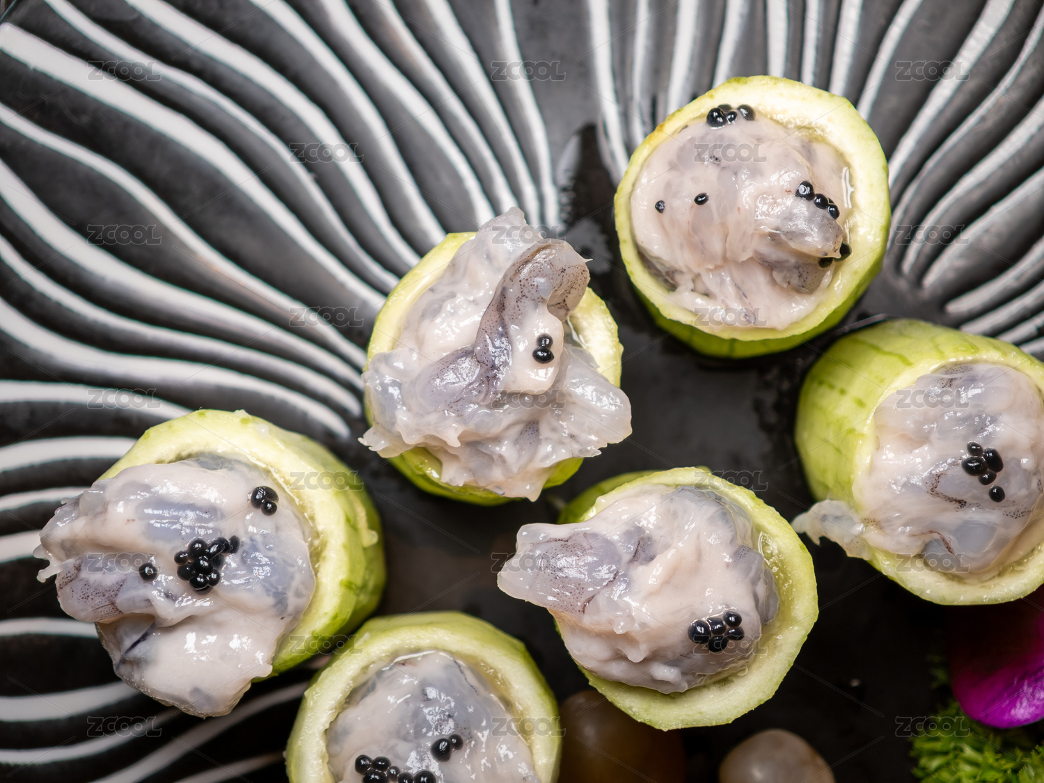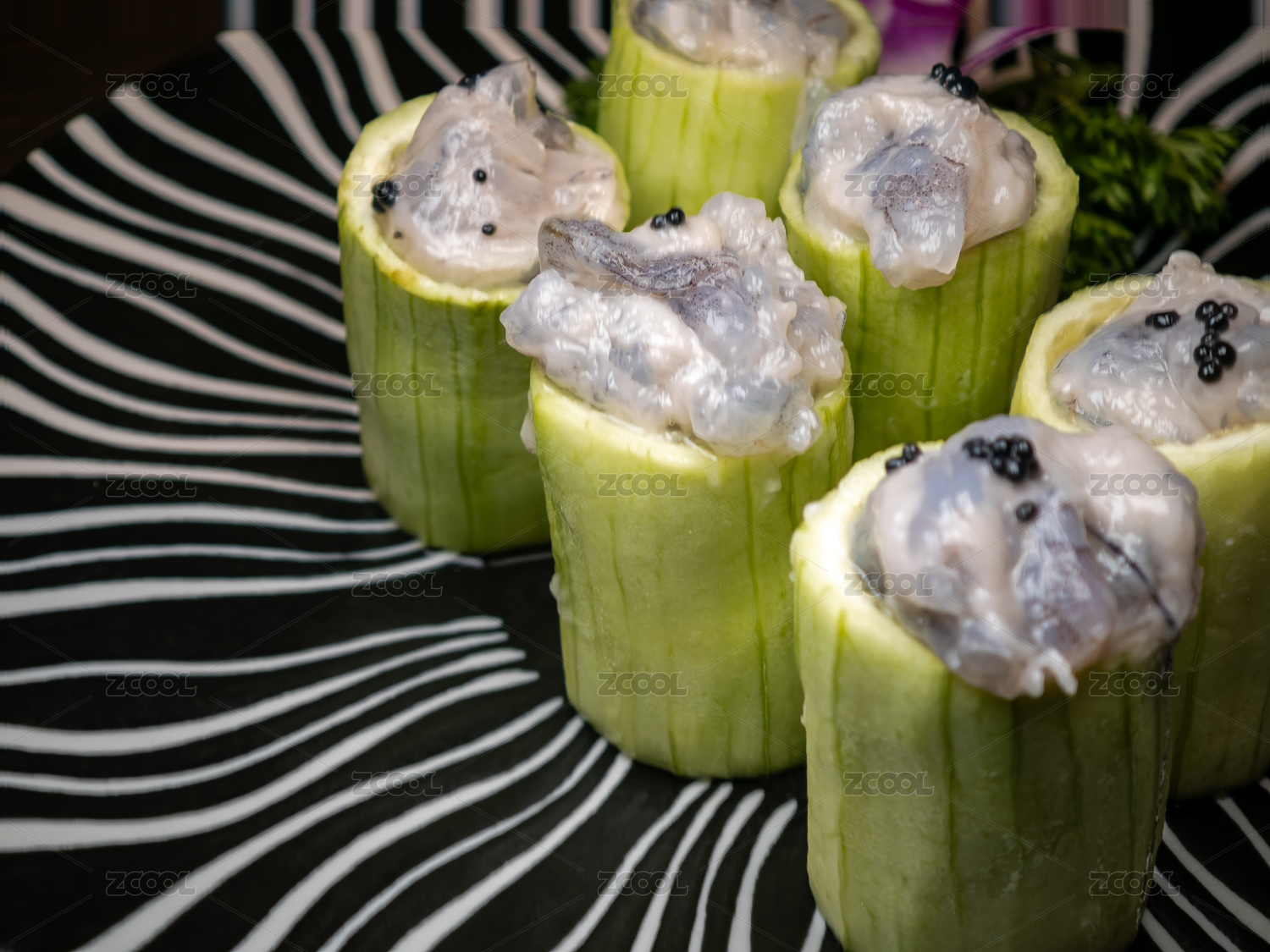 装在餐盘里的火锅食材青瓜酿手打虾滑