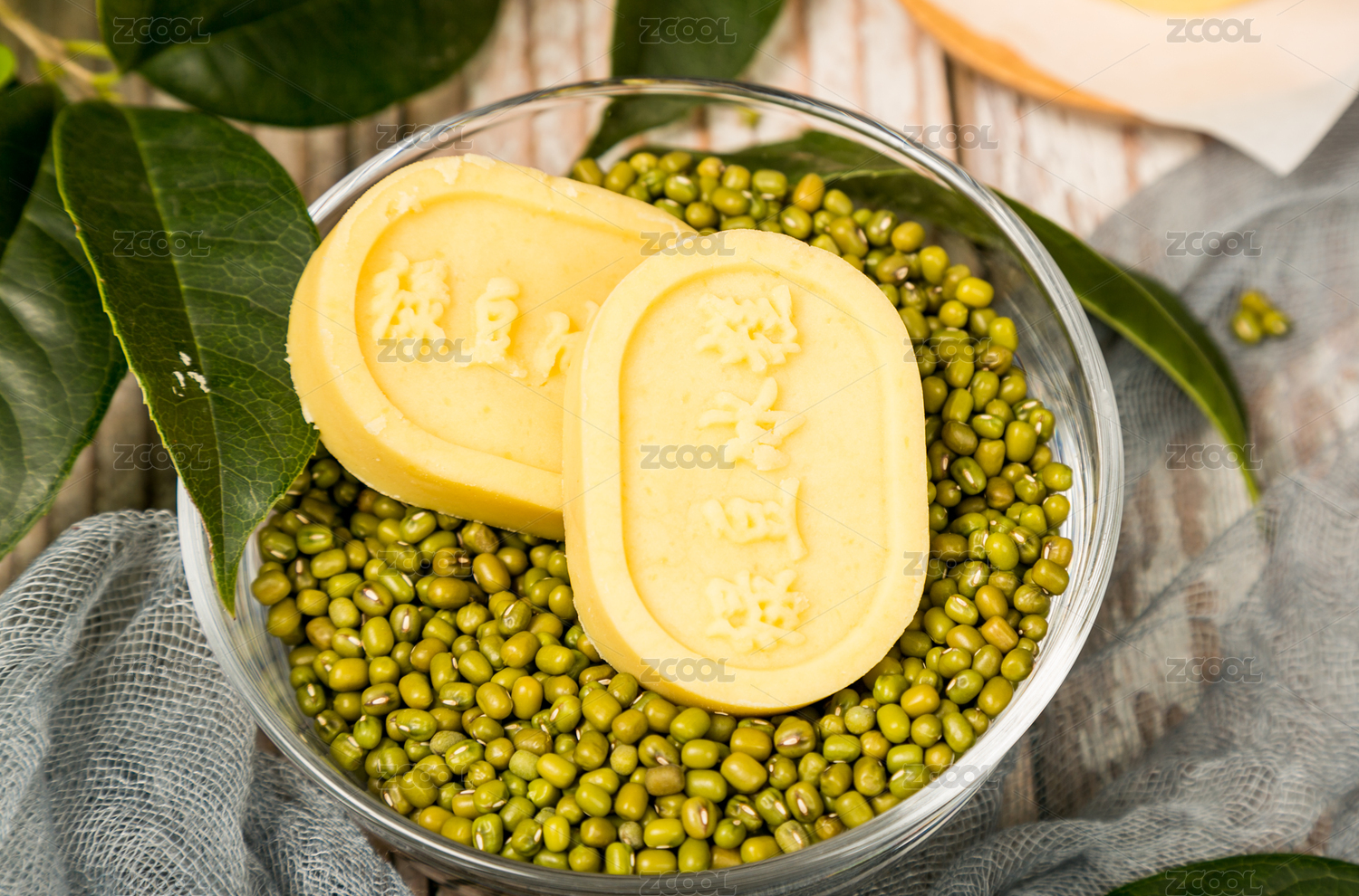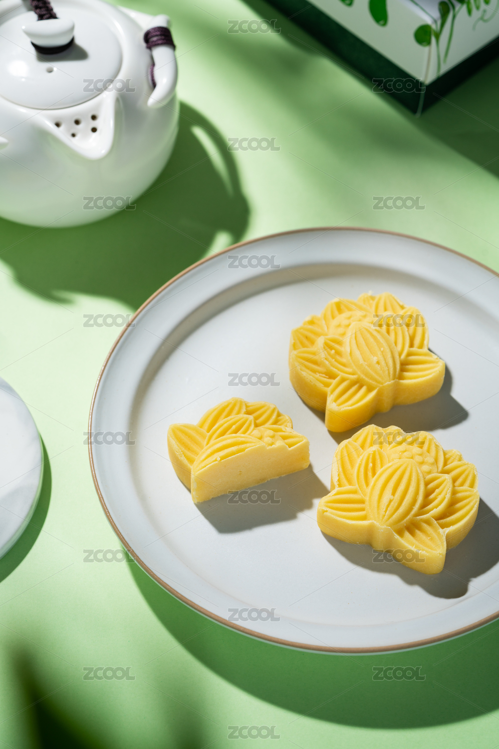 白底上一只横放的绿豆冰糕