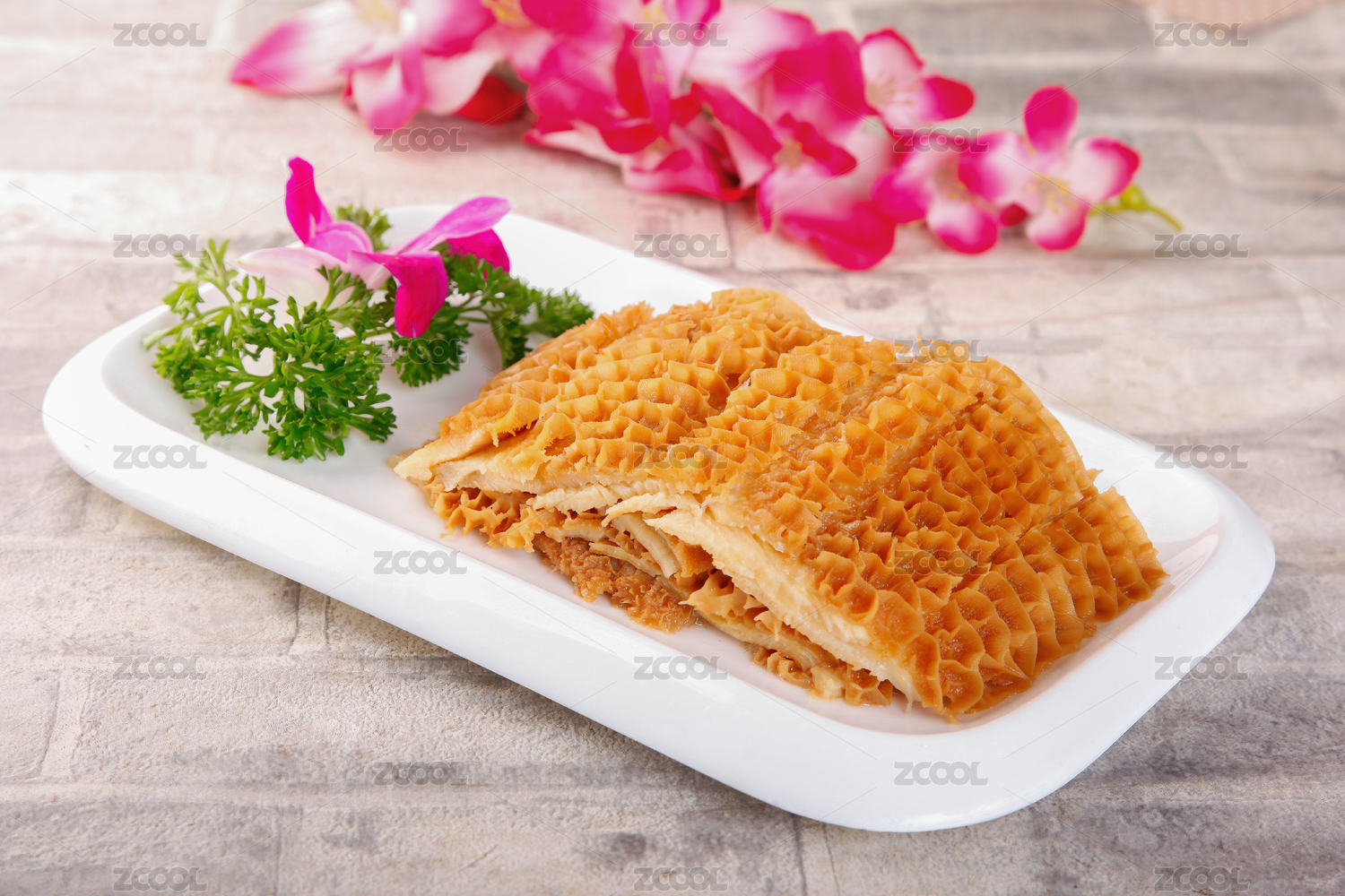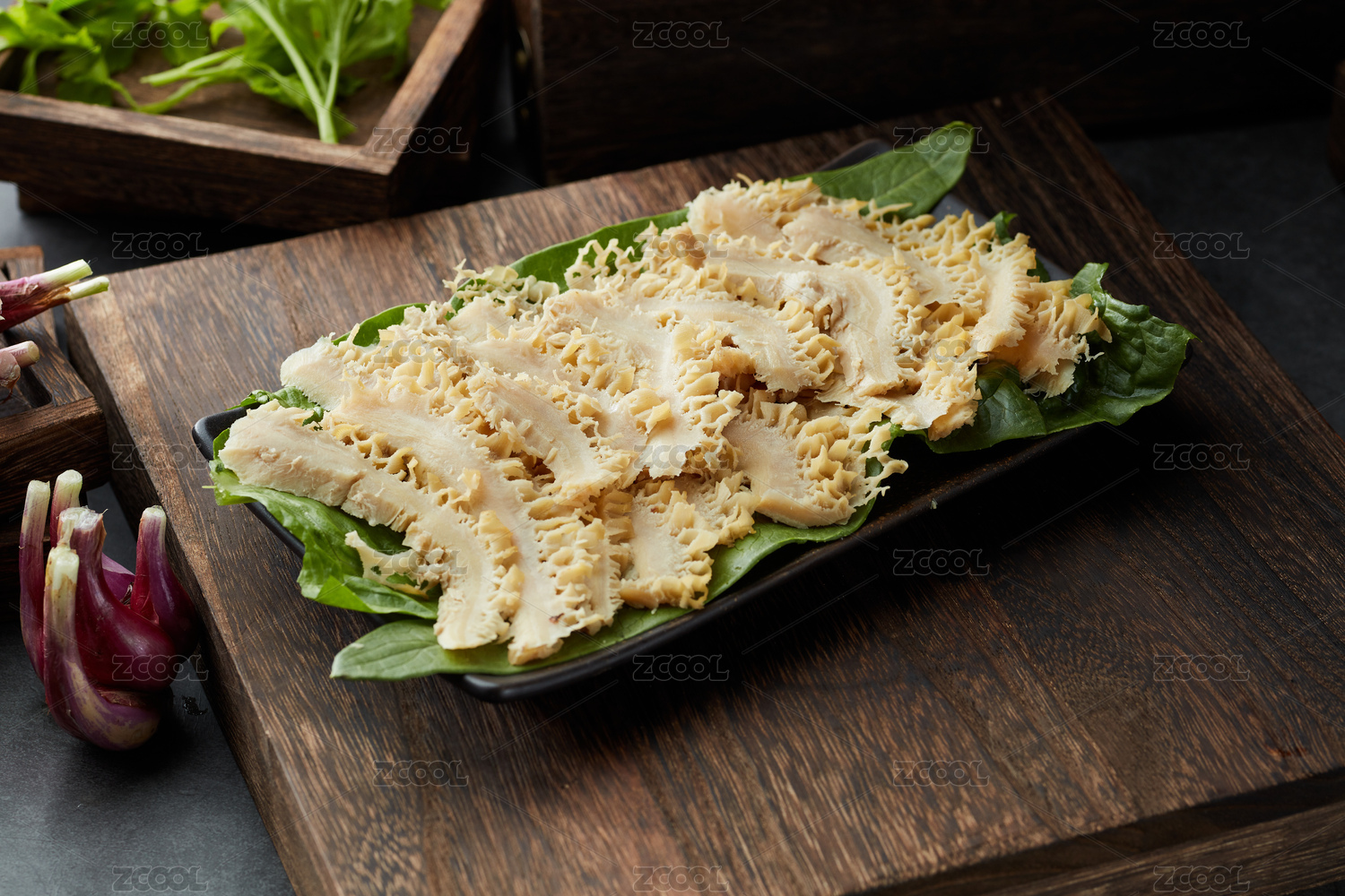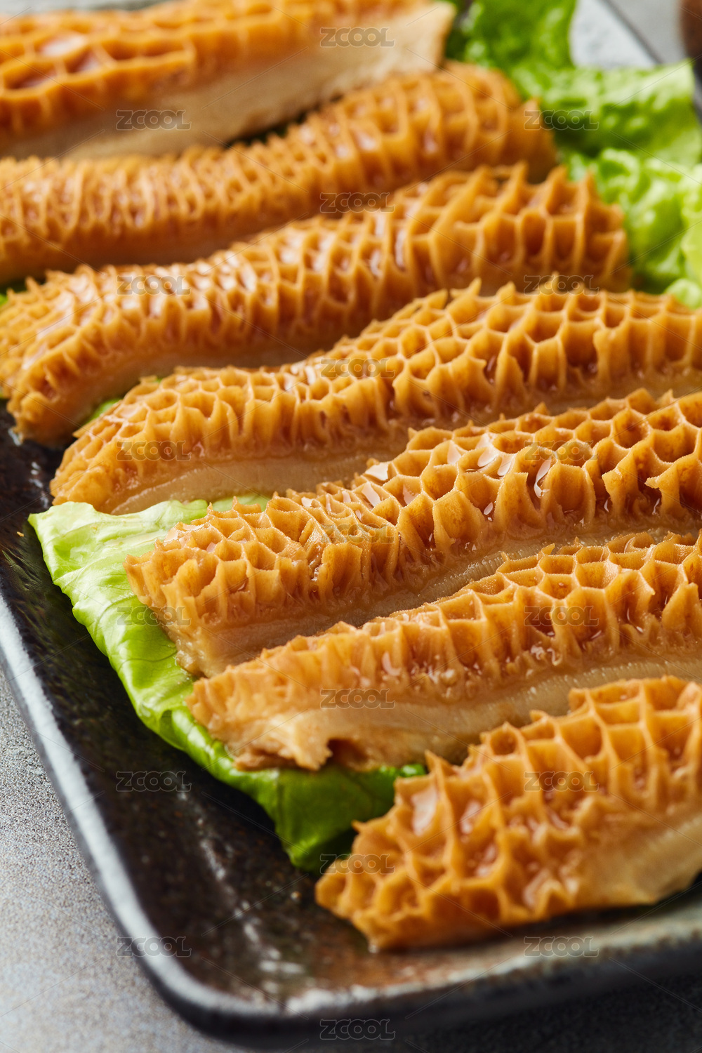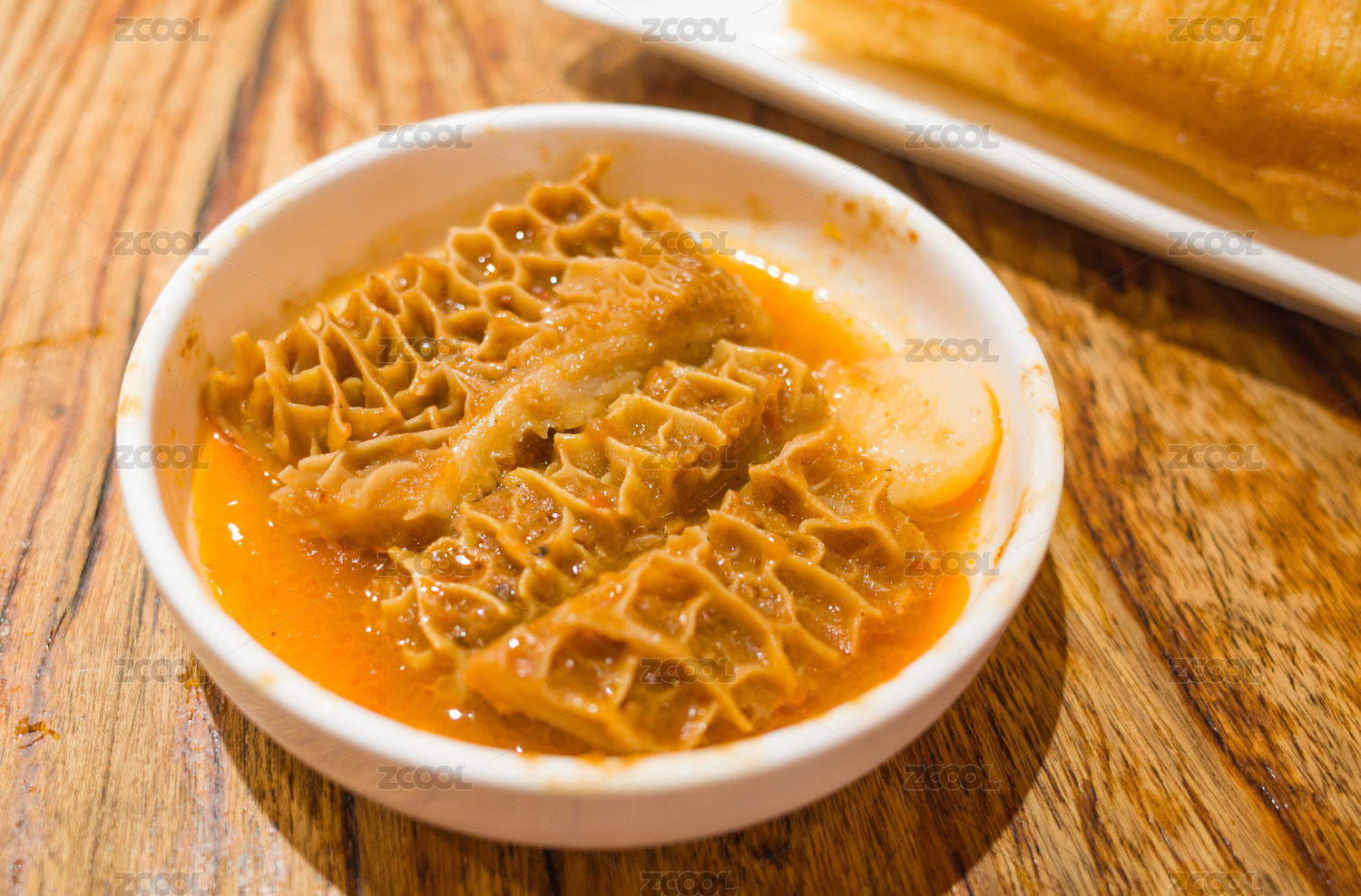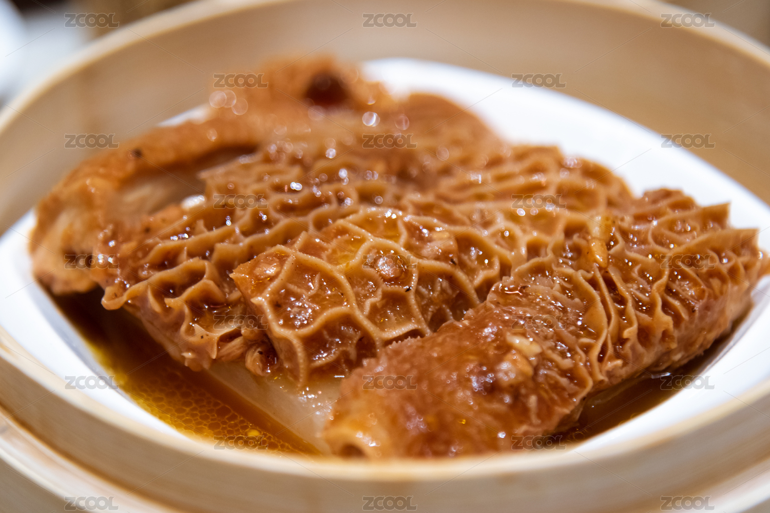 棕色木纹桌上 放着一份腌制金钱肚
