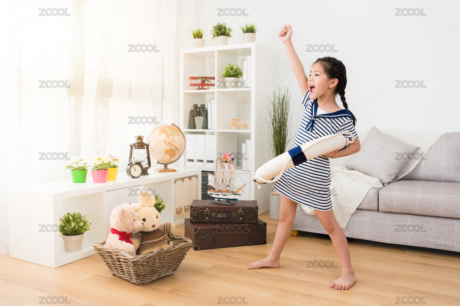 开朗的年轻小女孩水手携带救生圈站在游戏室的木地板,使姿势准备冒险。