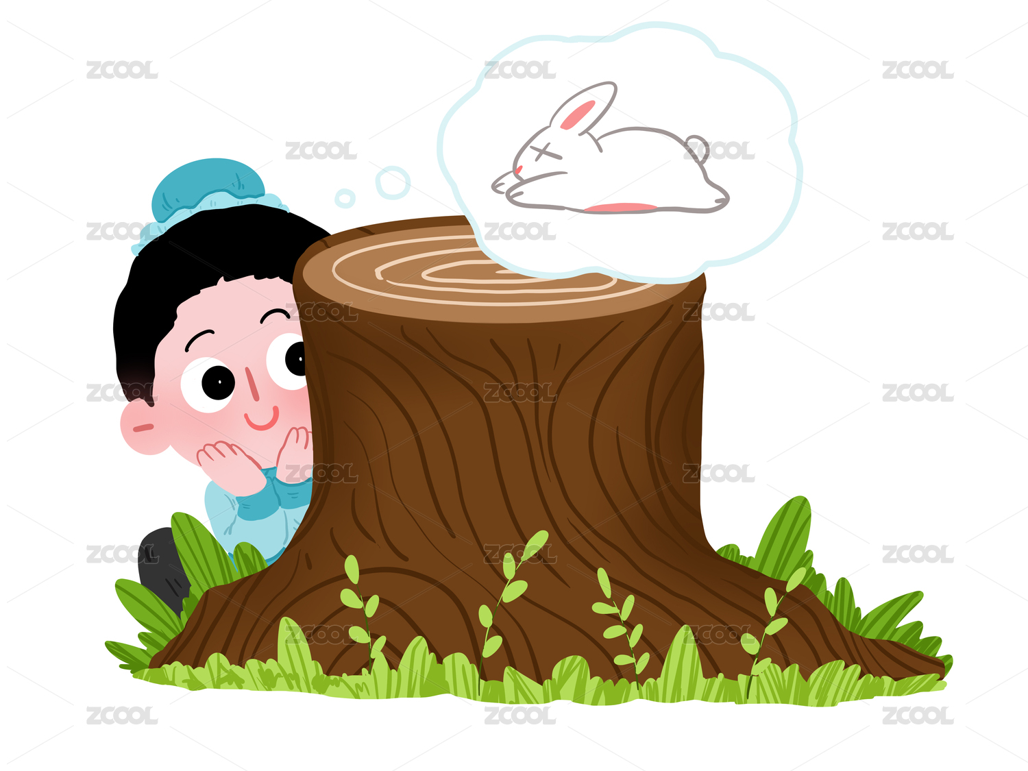 成语守株待兔蓝衣男背靠树桩等待兔子旁边有