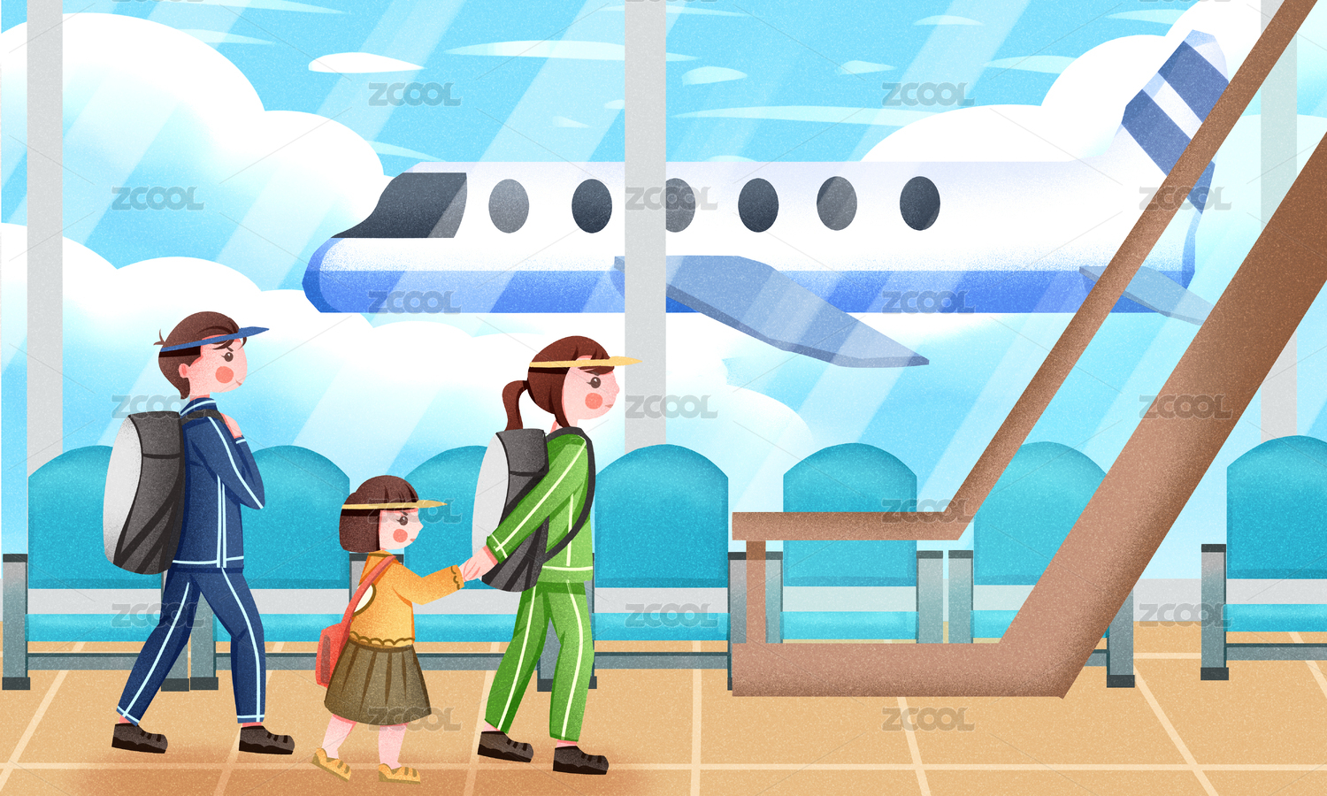 一家人手牵手旅行途中在飞机场候机厅行走 小清新风格世界旅游日插画