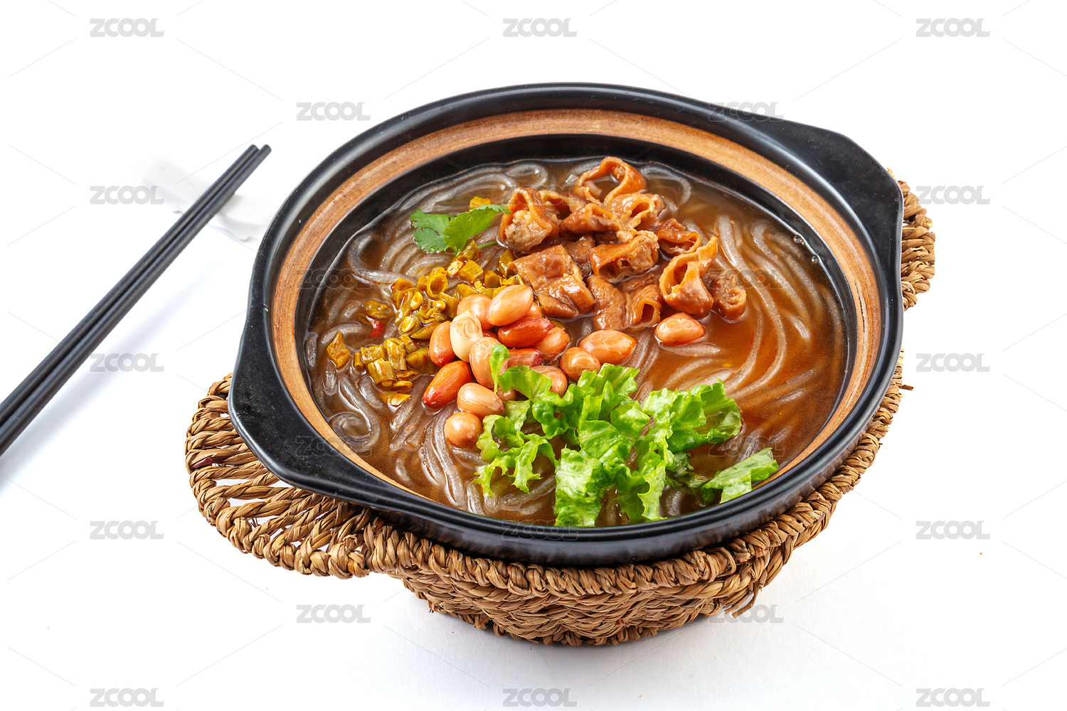 黑色砂锅装的砂锅肥肠摆放在麻布垫子上
