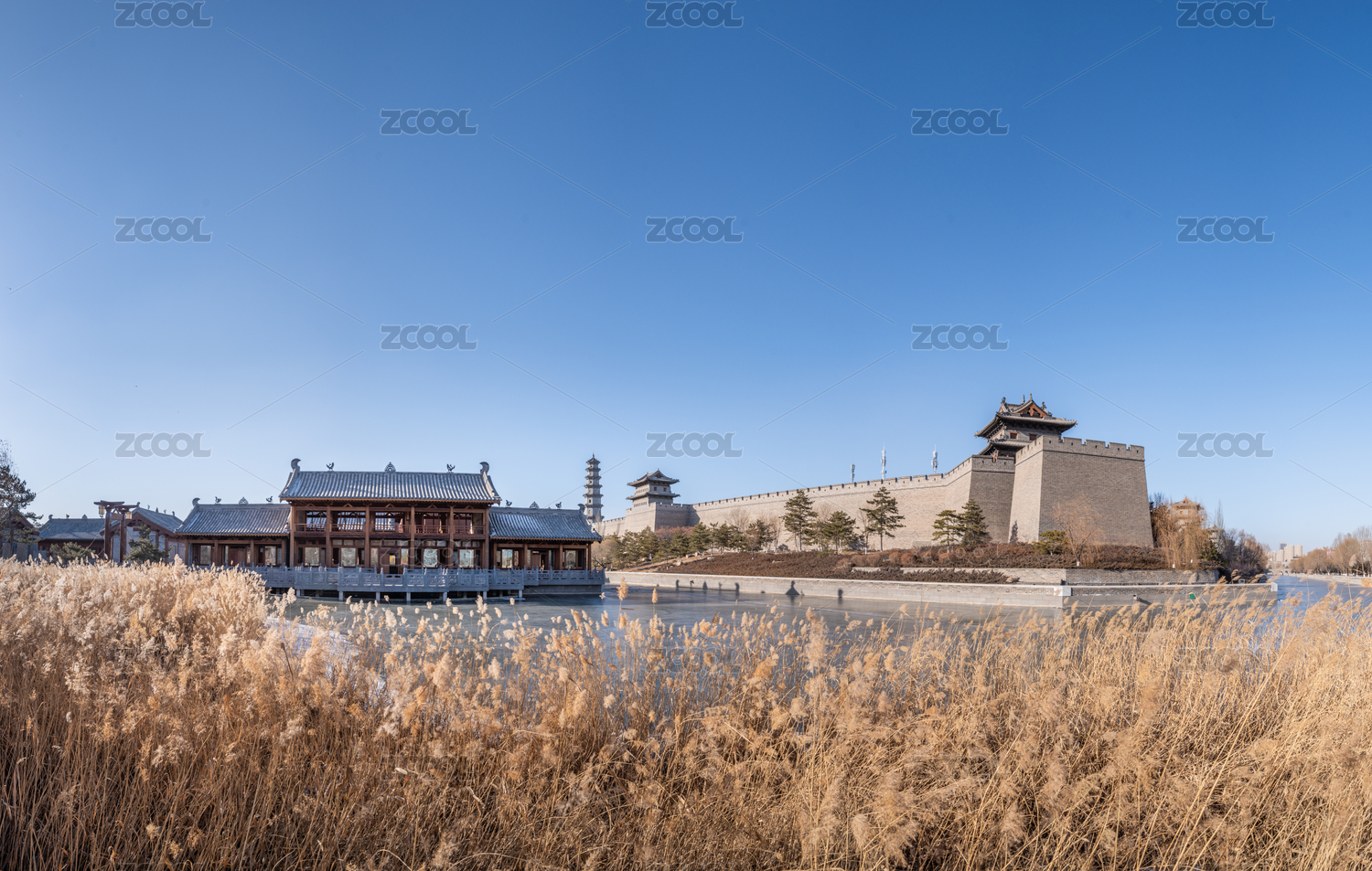 中国山西大同古城墙护城河风光