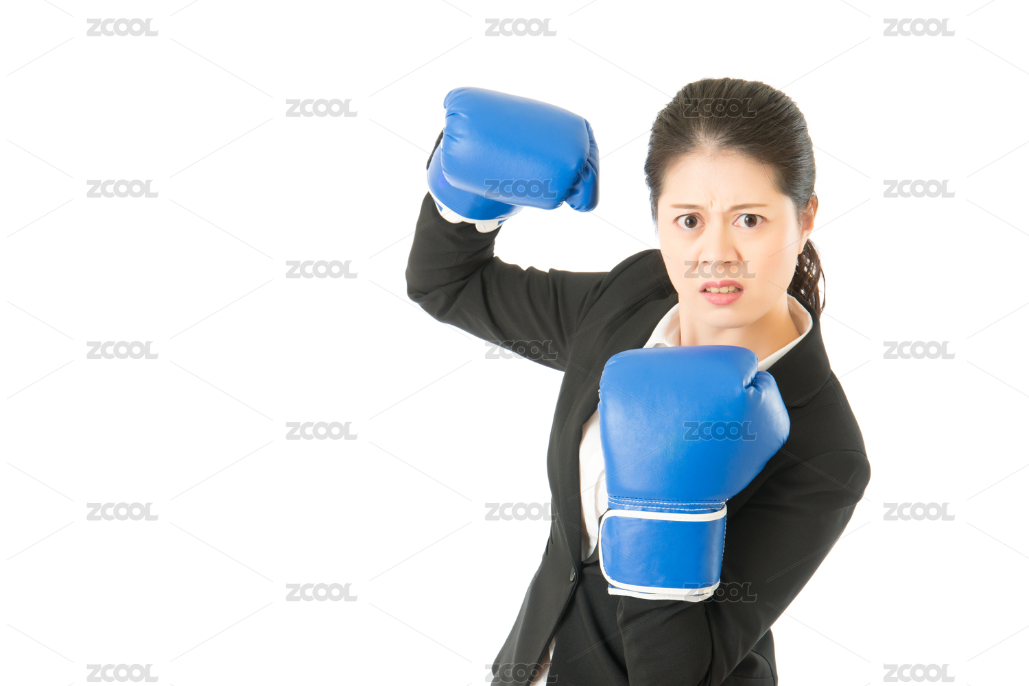 意志坚定的女人假装打攻击姿势一拳拳击手套。商人戴着拳击手套出弯曲的肌肉隔绝在白色背景。混血亚洲的中国模式。