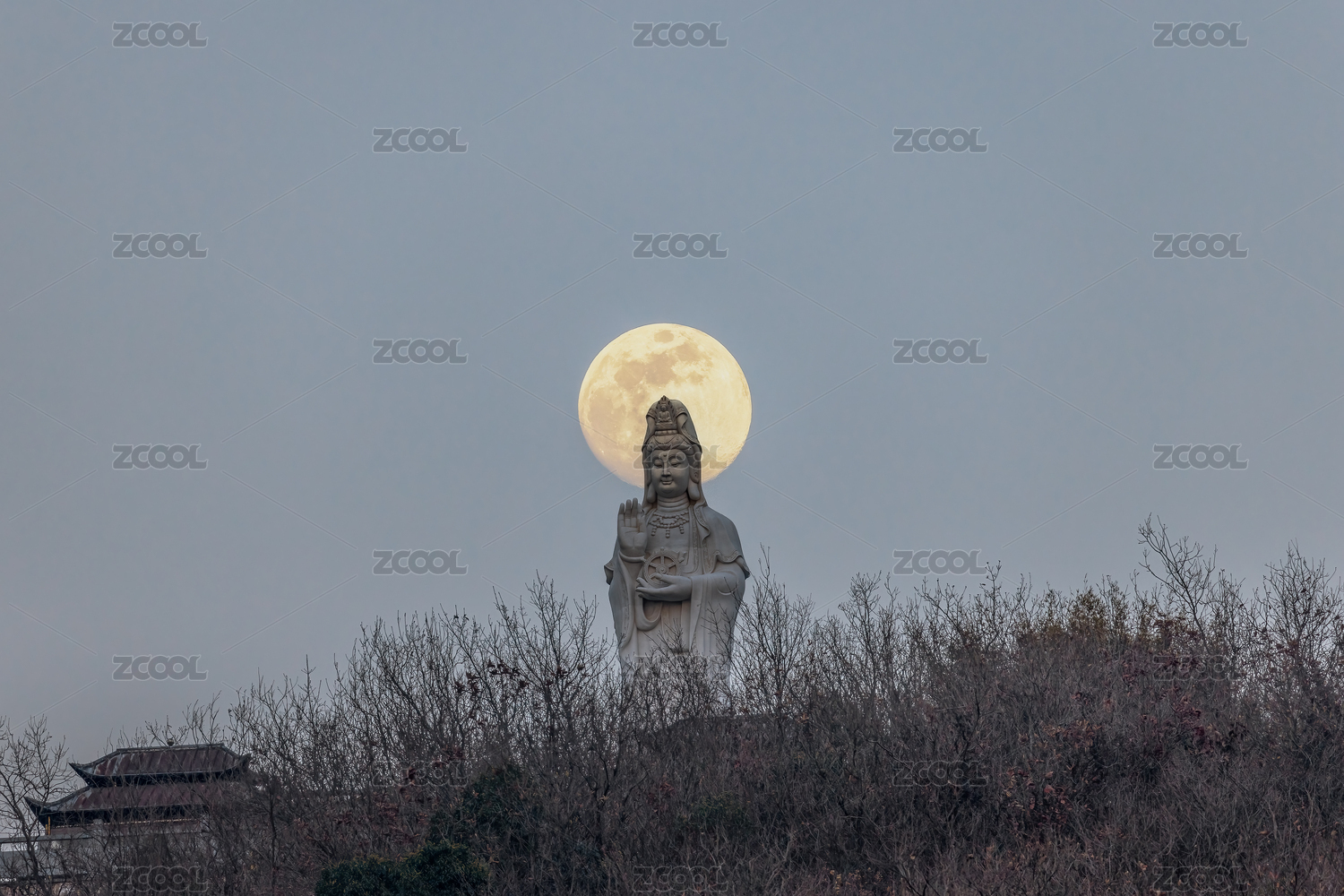 嘉兴海宁尖山景区观音雕像超级月亮