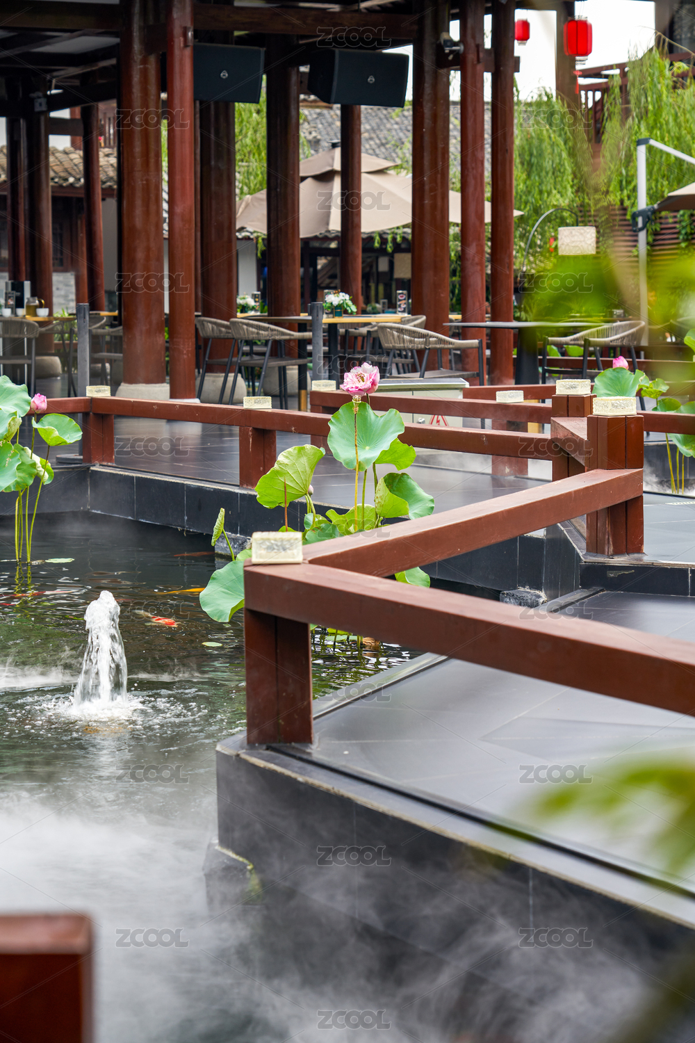 精美豪华的中式花园莲花锦鲤池