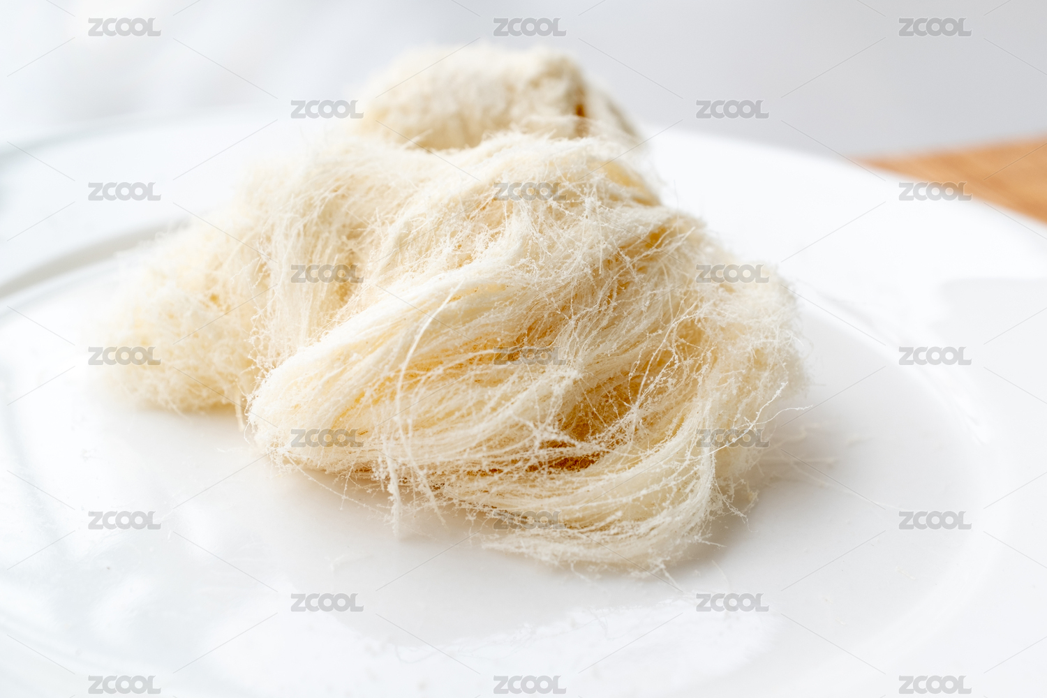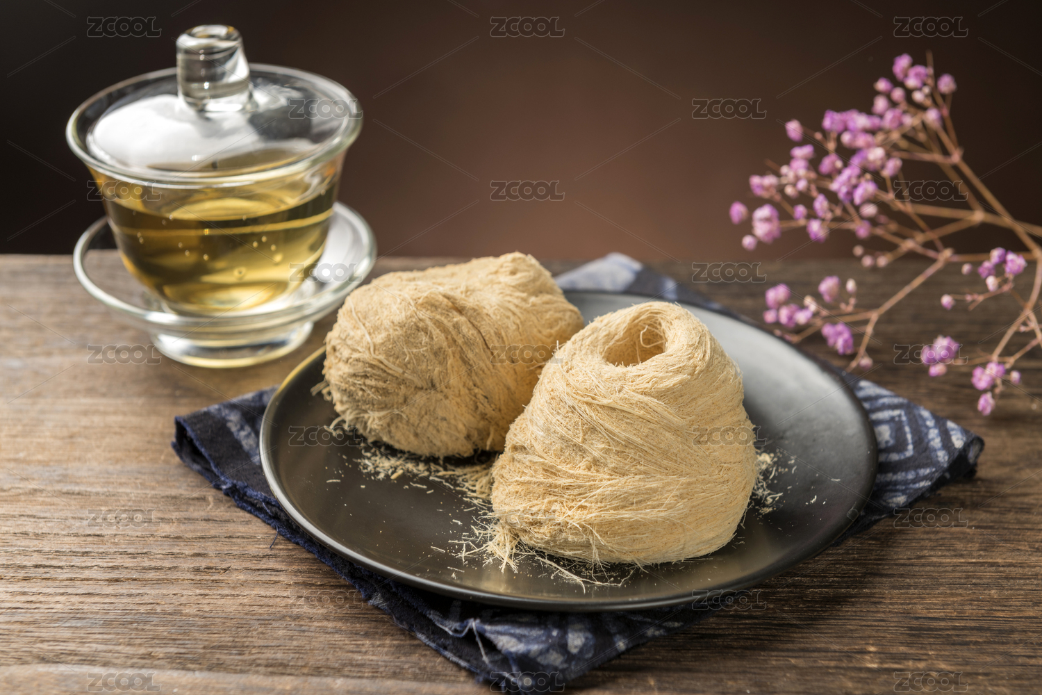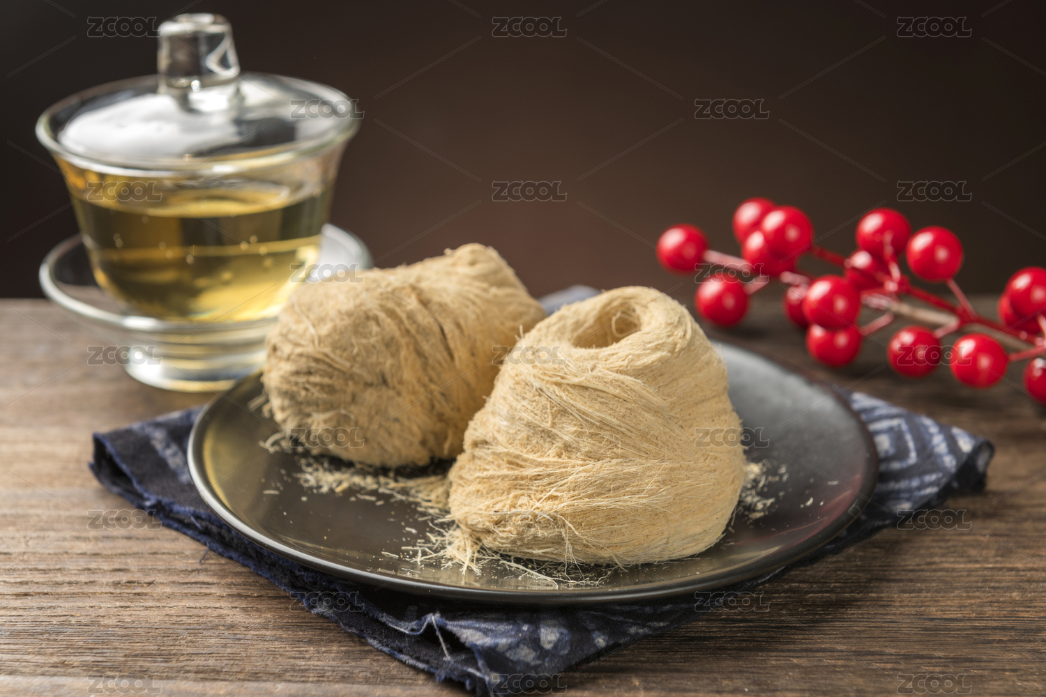 传统小吃龙须酥蟠桃酥摆放在桌面上特写