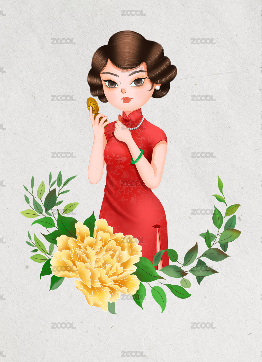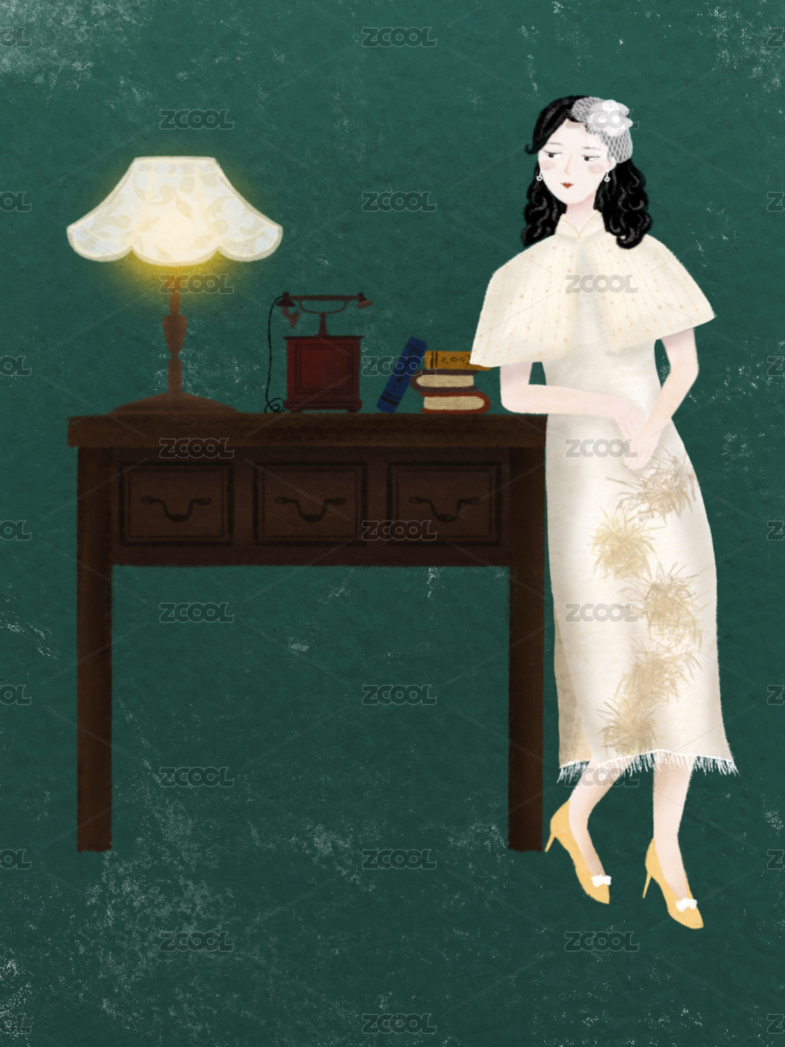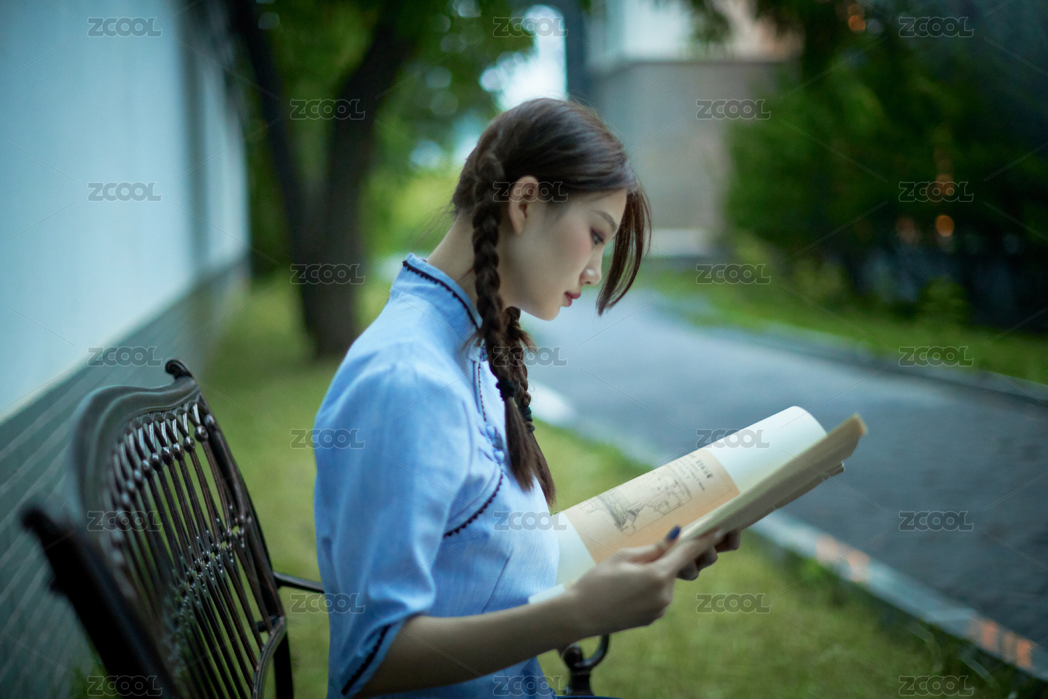 庭院中手拿复古书籍倚靠大树的民国风少女
