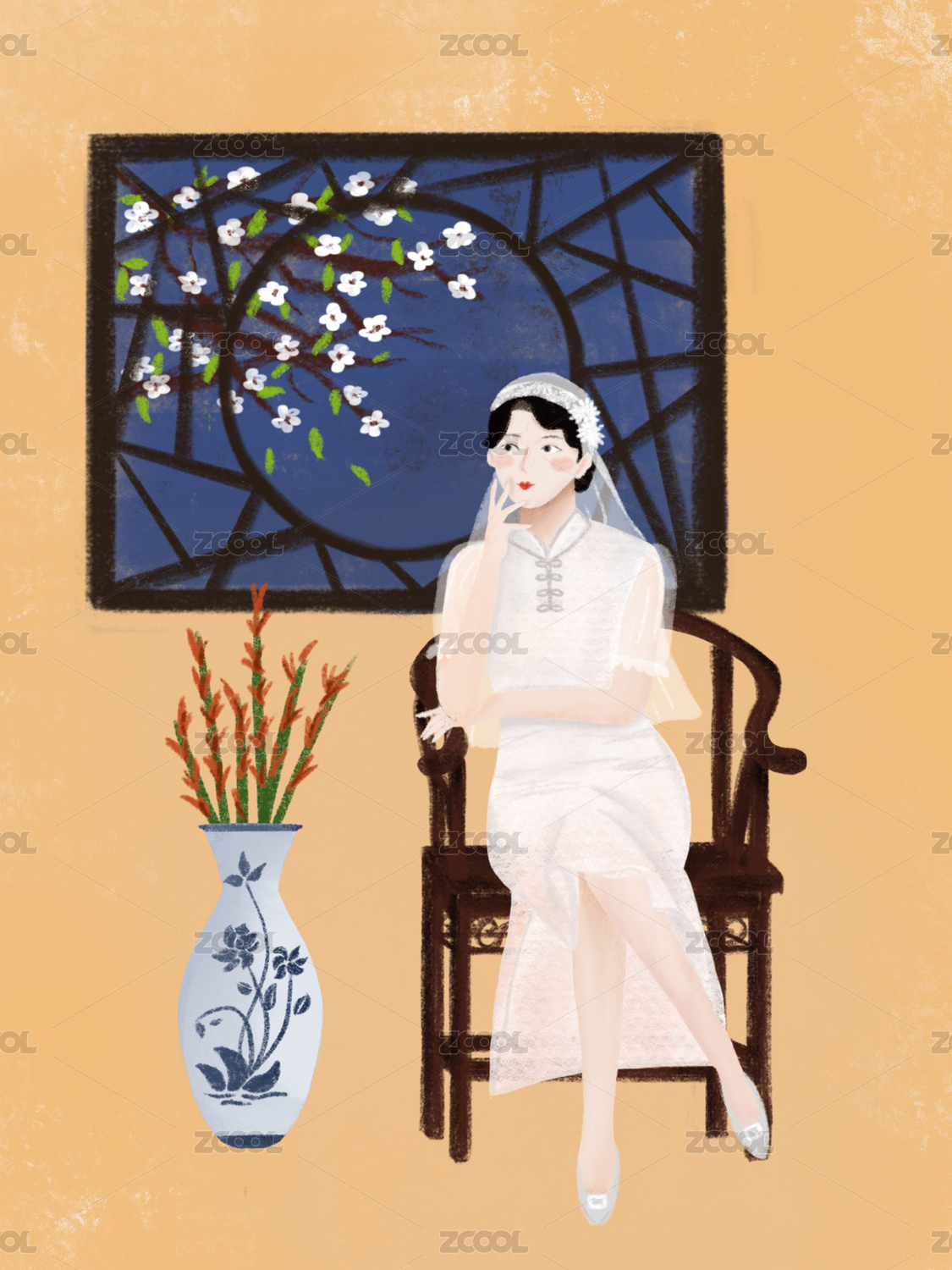 细雨中庭院里竹林前怀抱古书籍的民国风少女