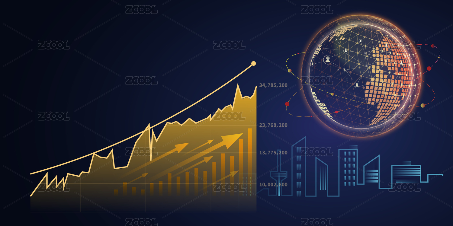全球化、国际化的金融市场,点线链接数码科技感的地球插画概念