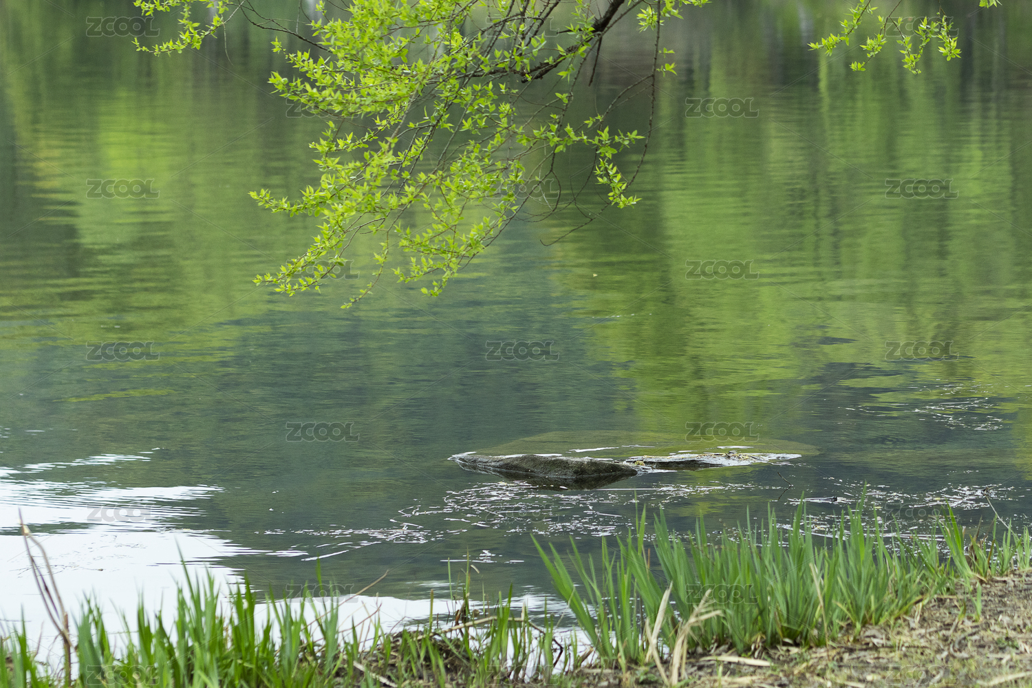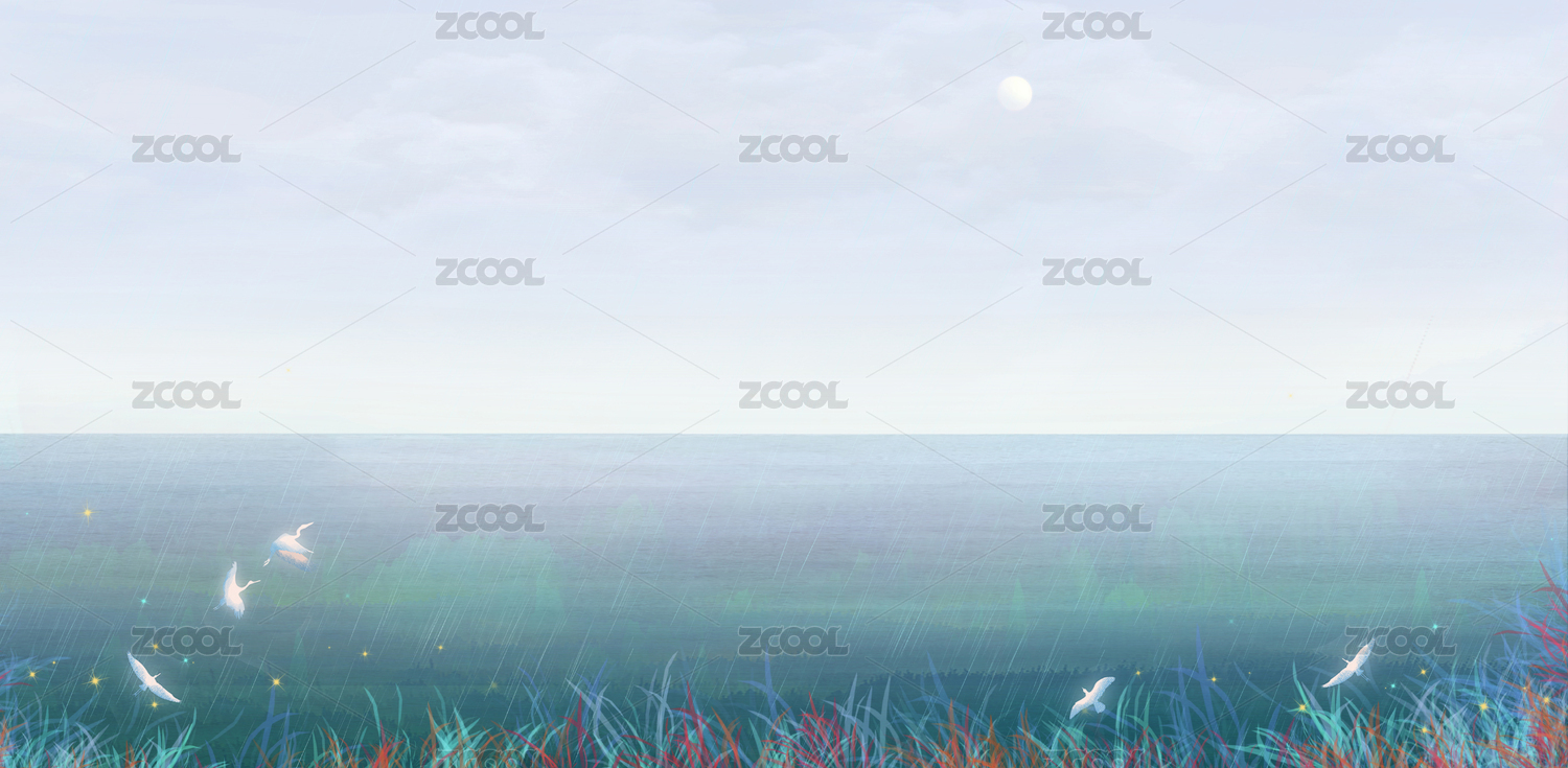春天春雨绵绵平静碧绿的湖面泛起雾气插画背景海报