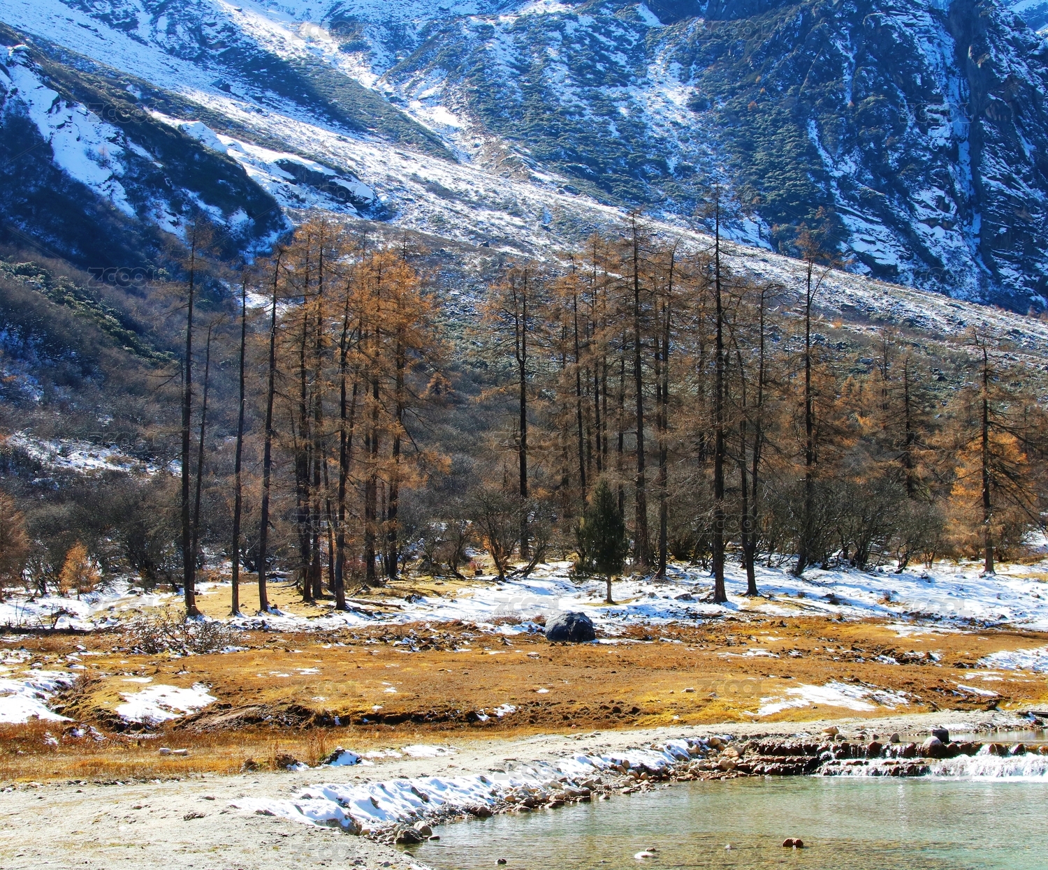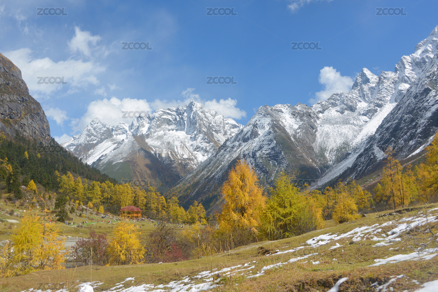 中国四川阿坝长坪沟雪山与秋林