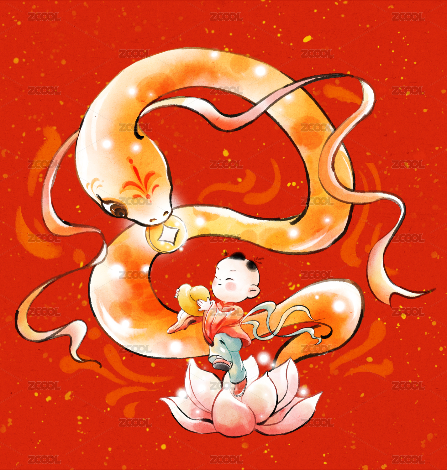 童子送财蛇年春节插画