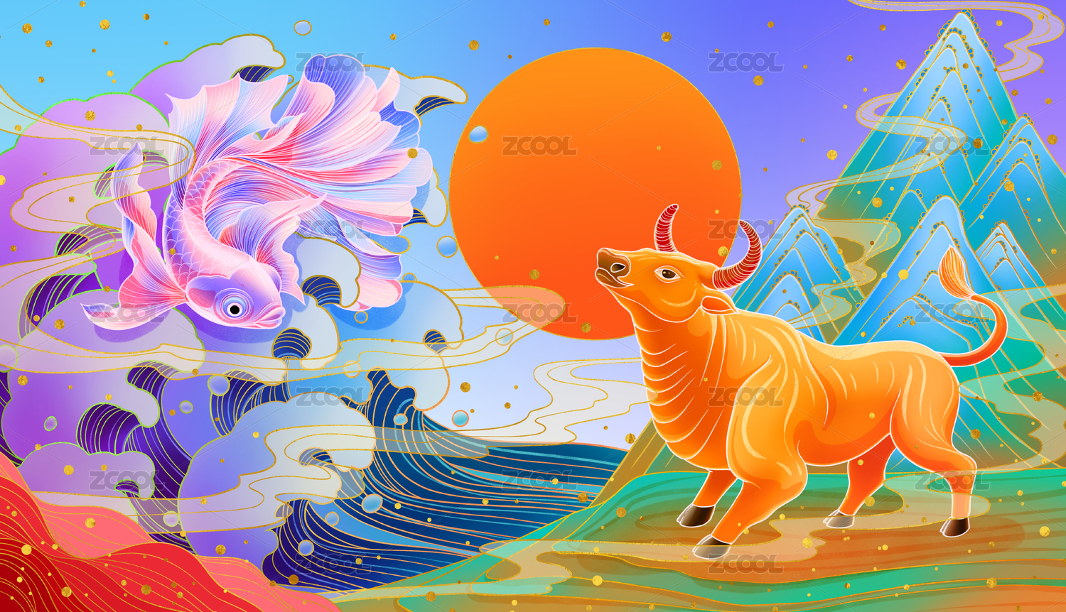 国潮风喜庆金箔牛年金牛送财锦鲤旭日东升