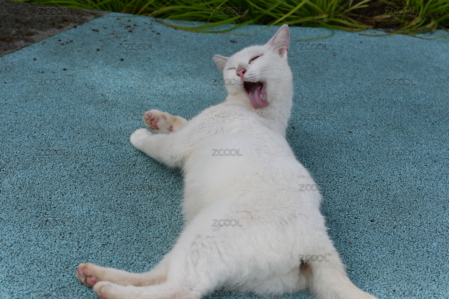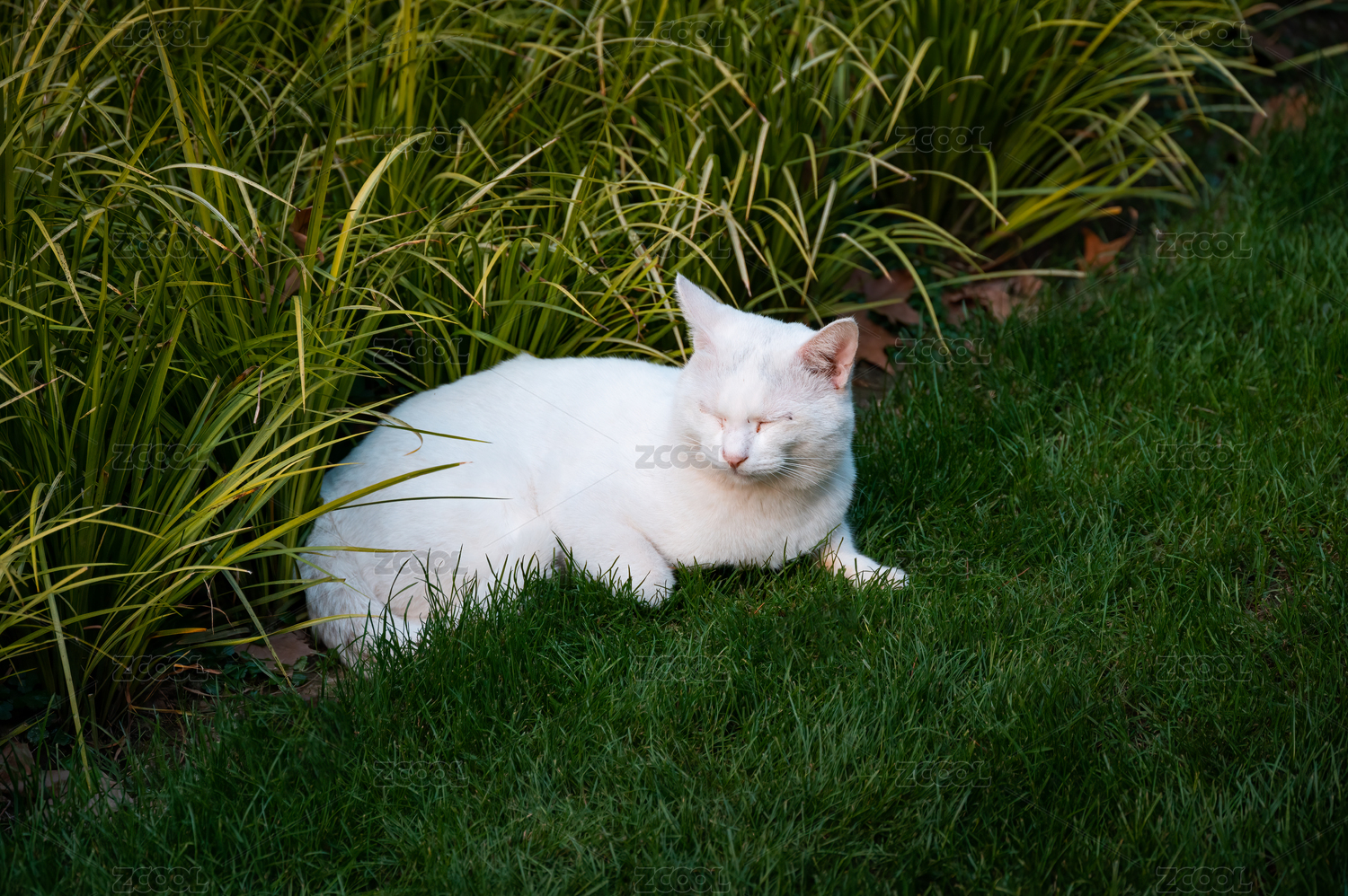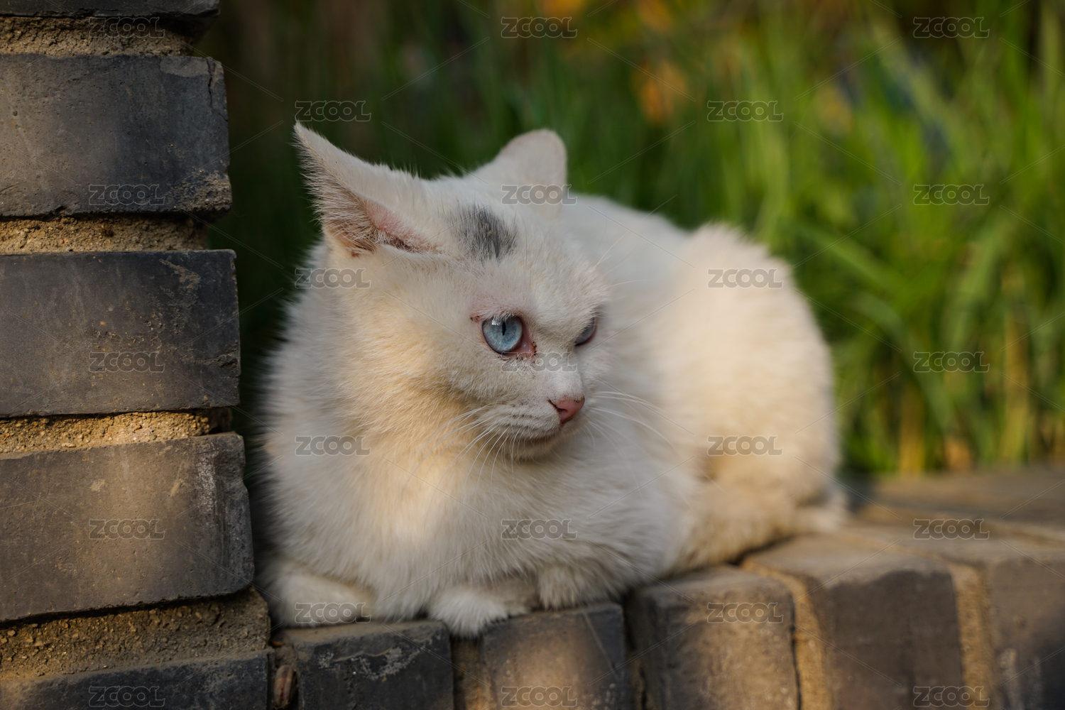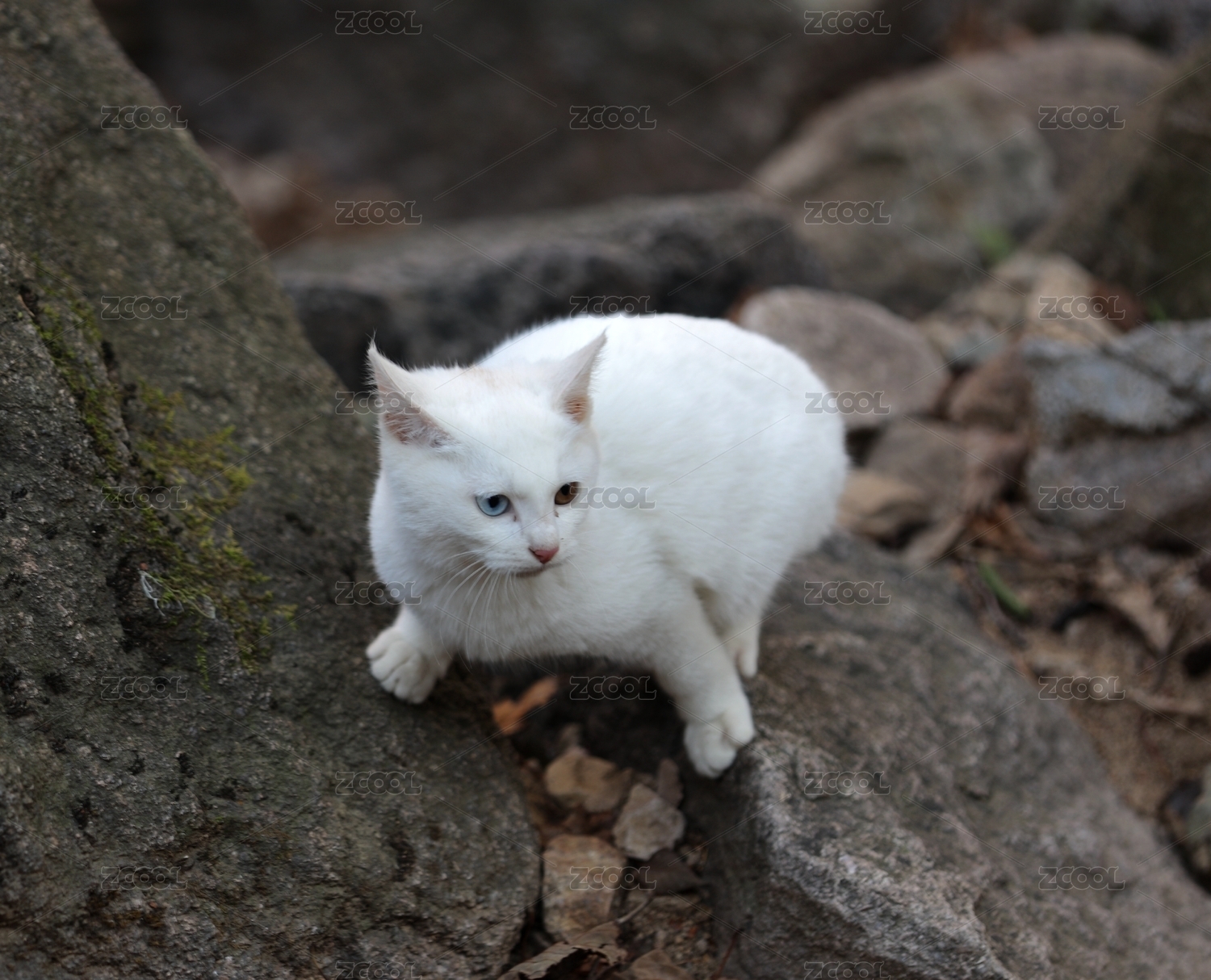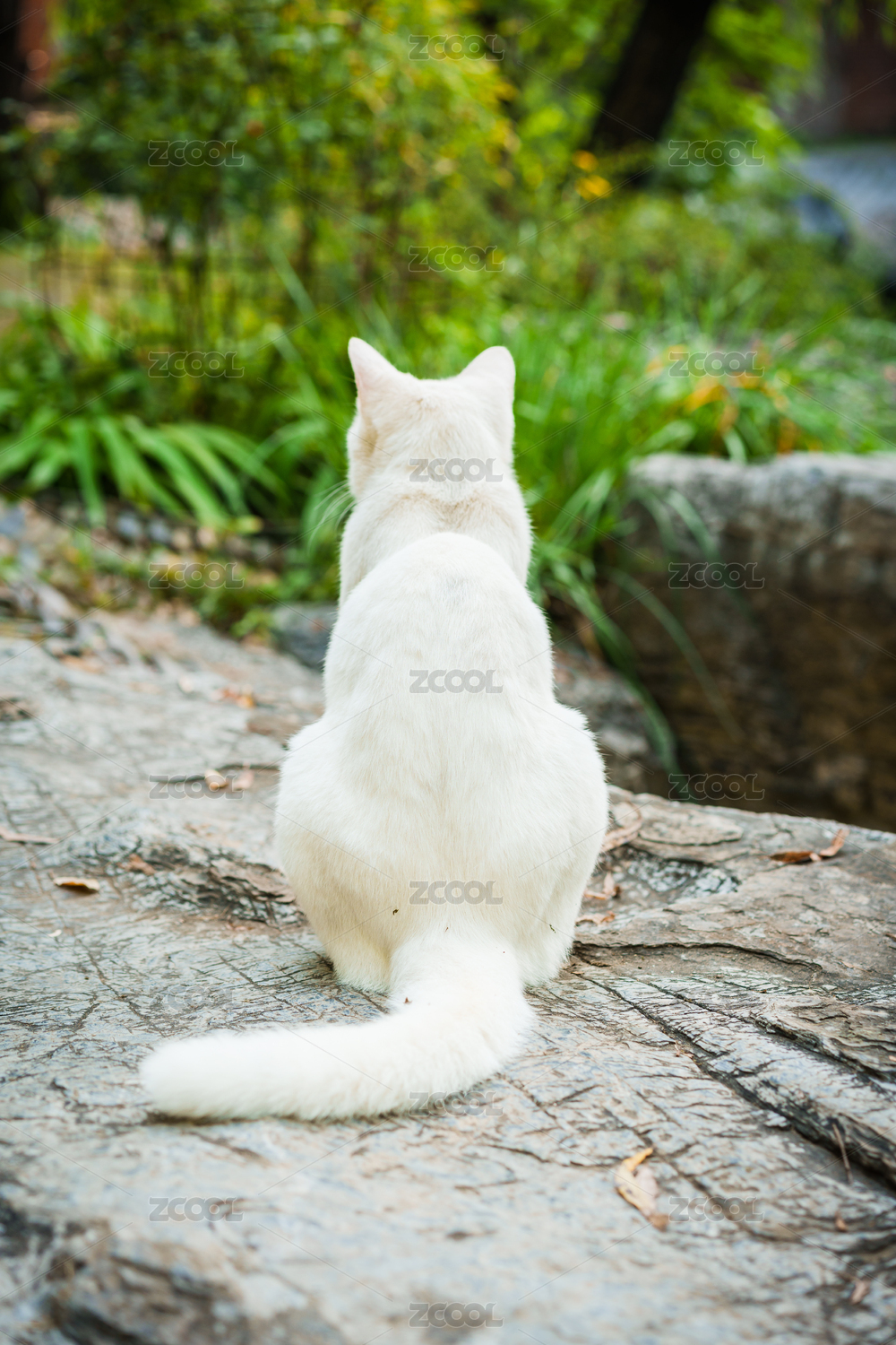 公园里一只趴在石头上被人抚摸耳朵的白猫