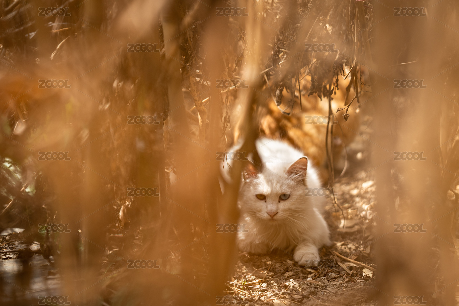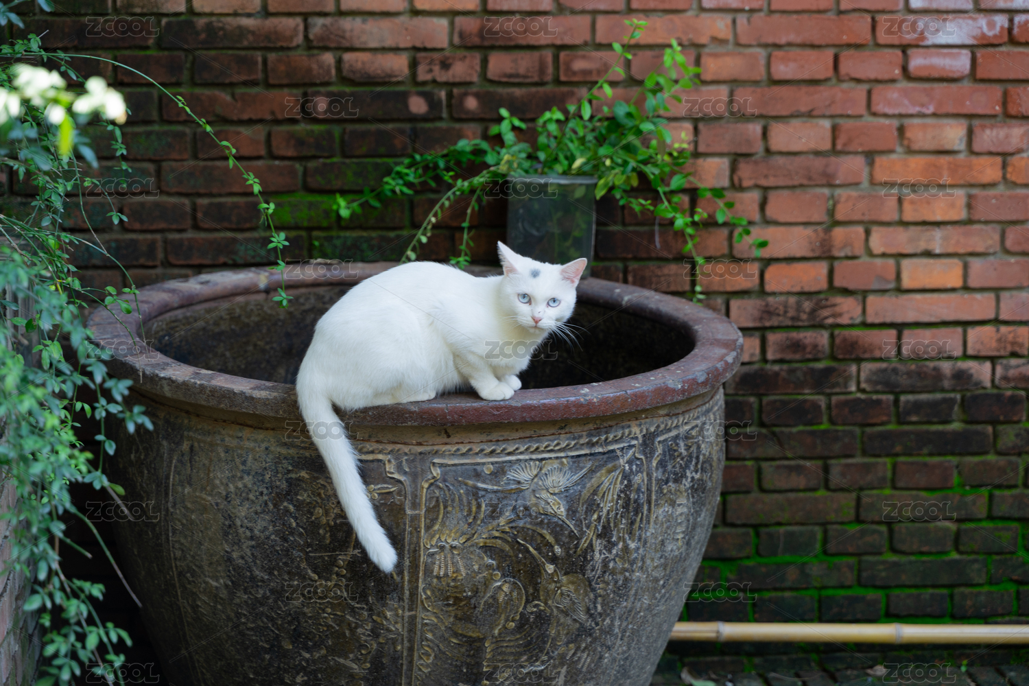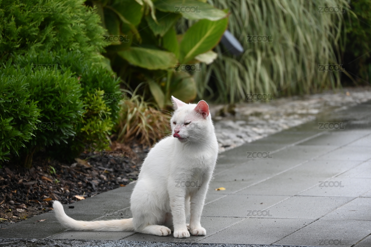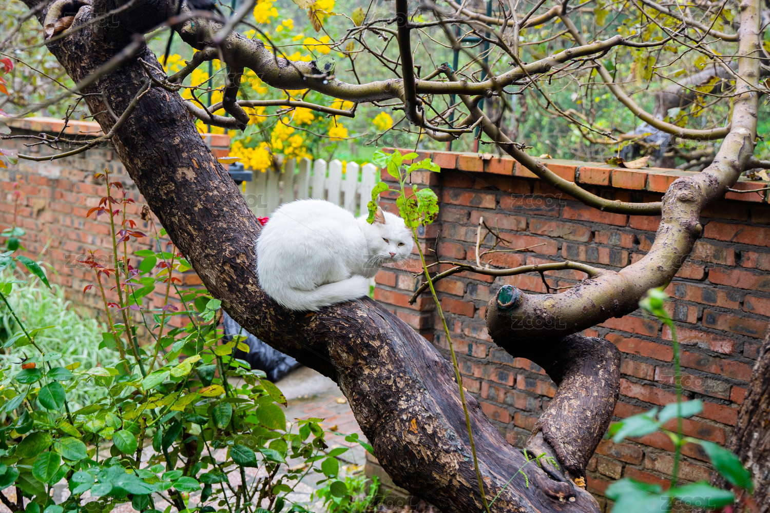 公园里一只趴在石头上被人抚摸耳朵的白猫