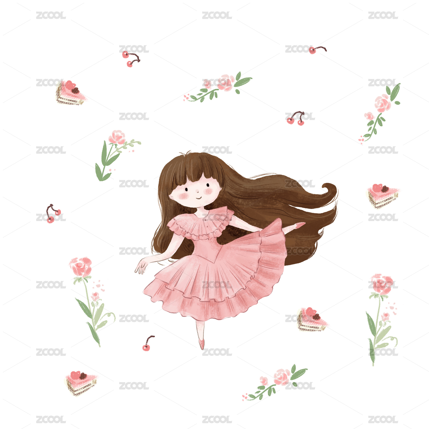 可爱水彩手绘卡通粉红女孩与甜品插图