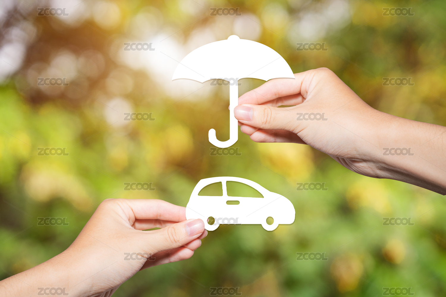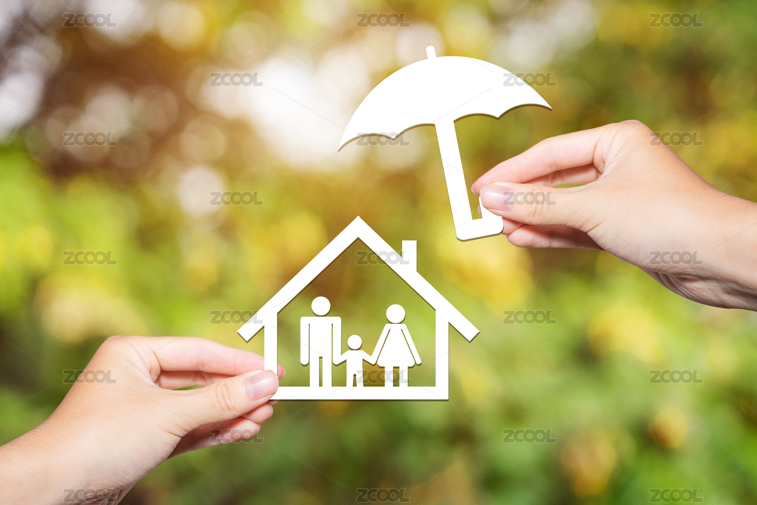 金融理财投资买房和谐家庭小人手牵手放心安心保险概念