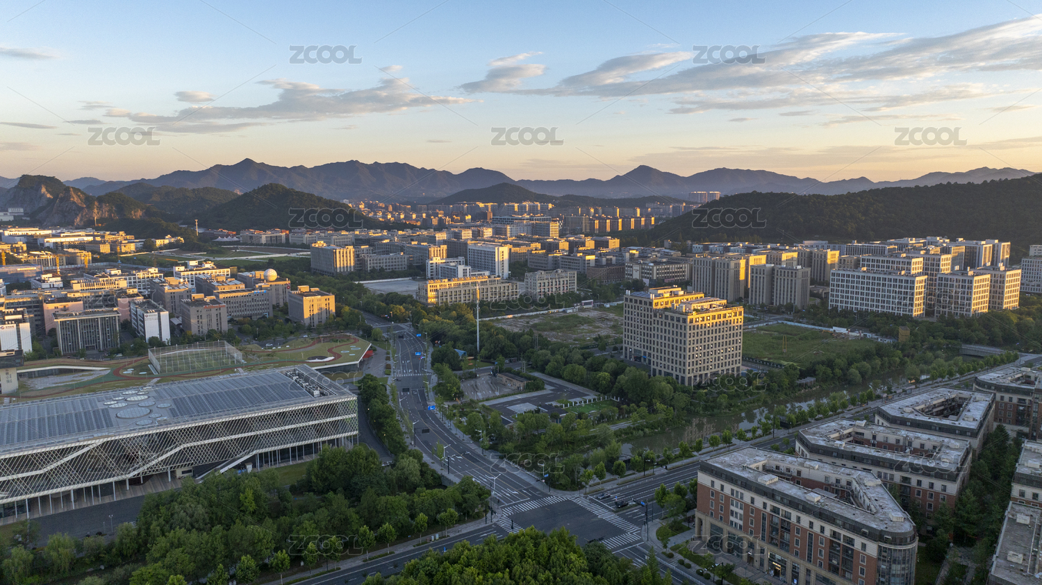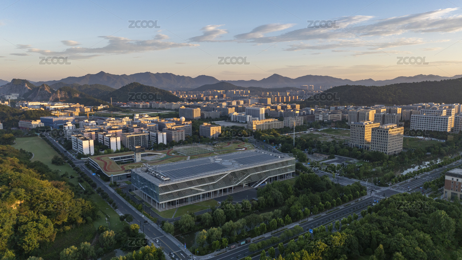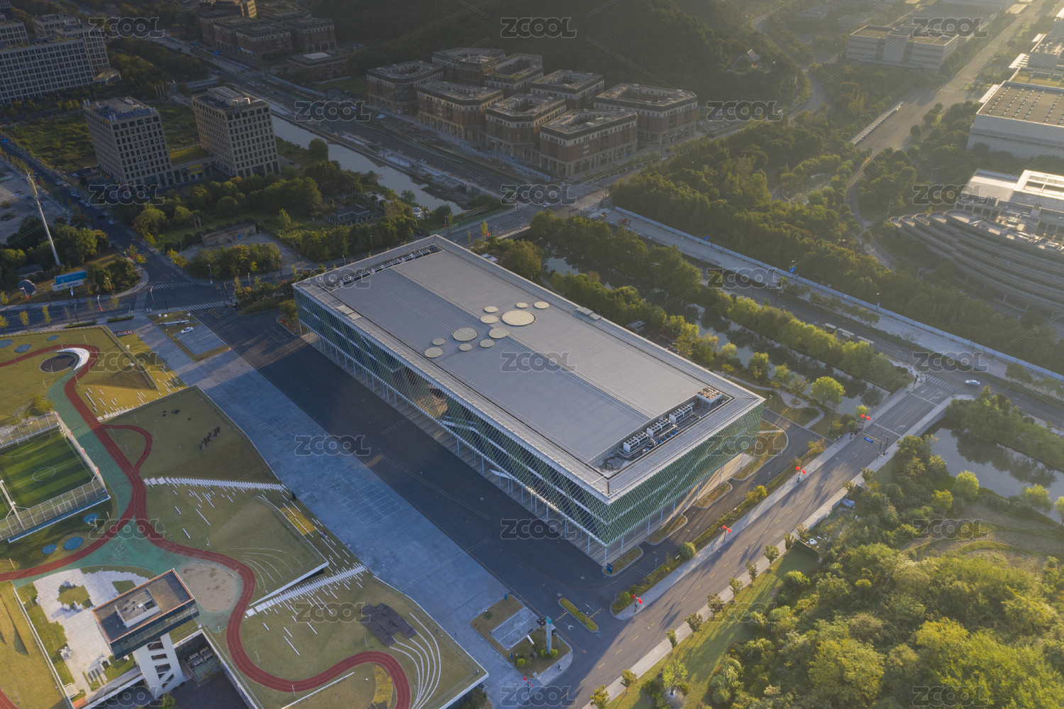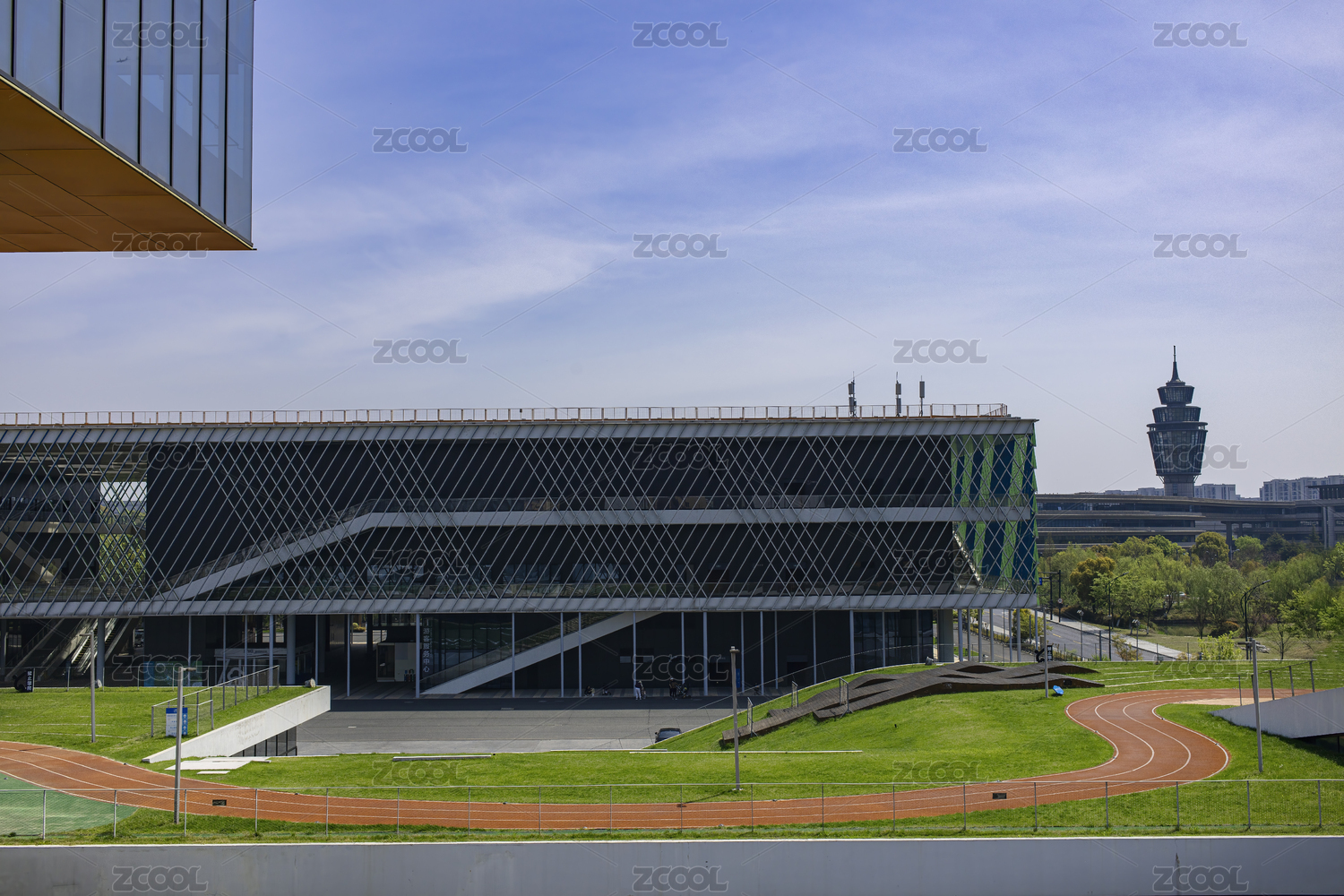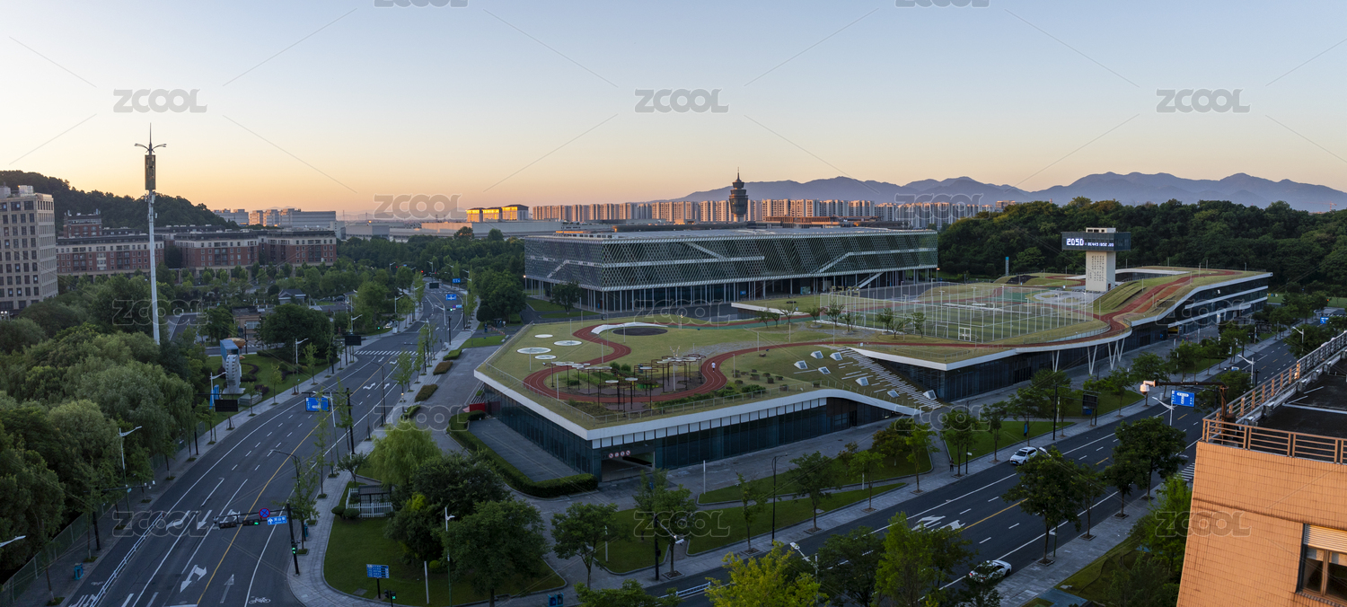 杭州云栖小镇会展中心的现代建筑和跑道