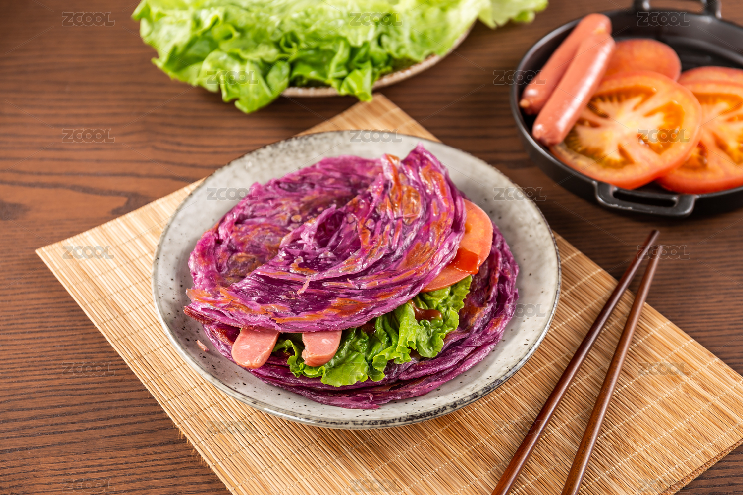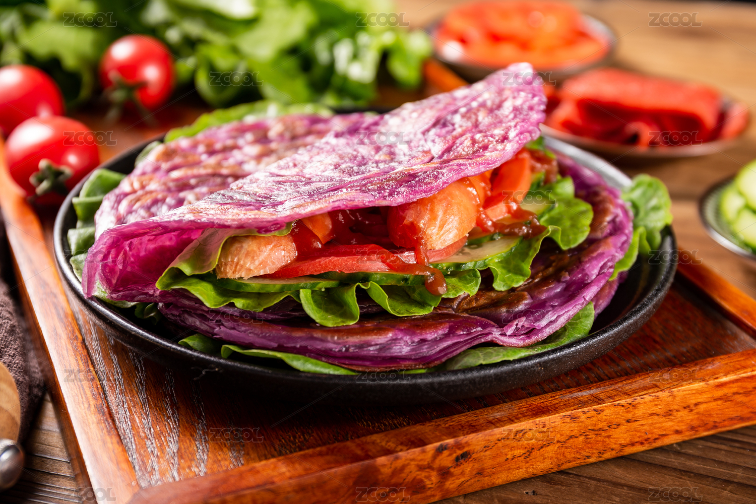 木板背景上一盘紫薯手抓饼