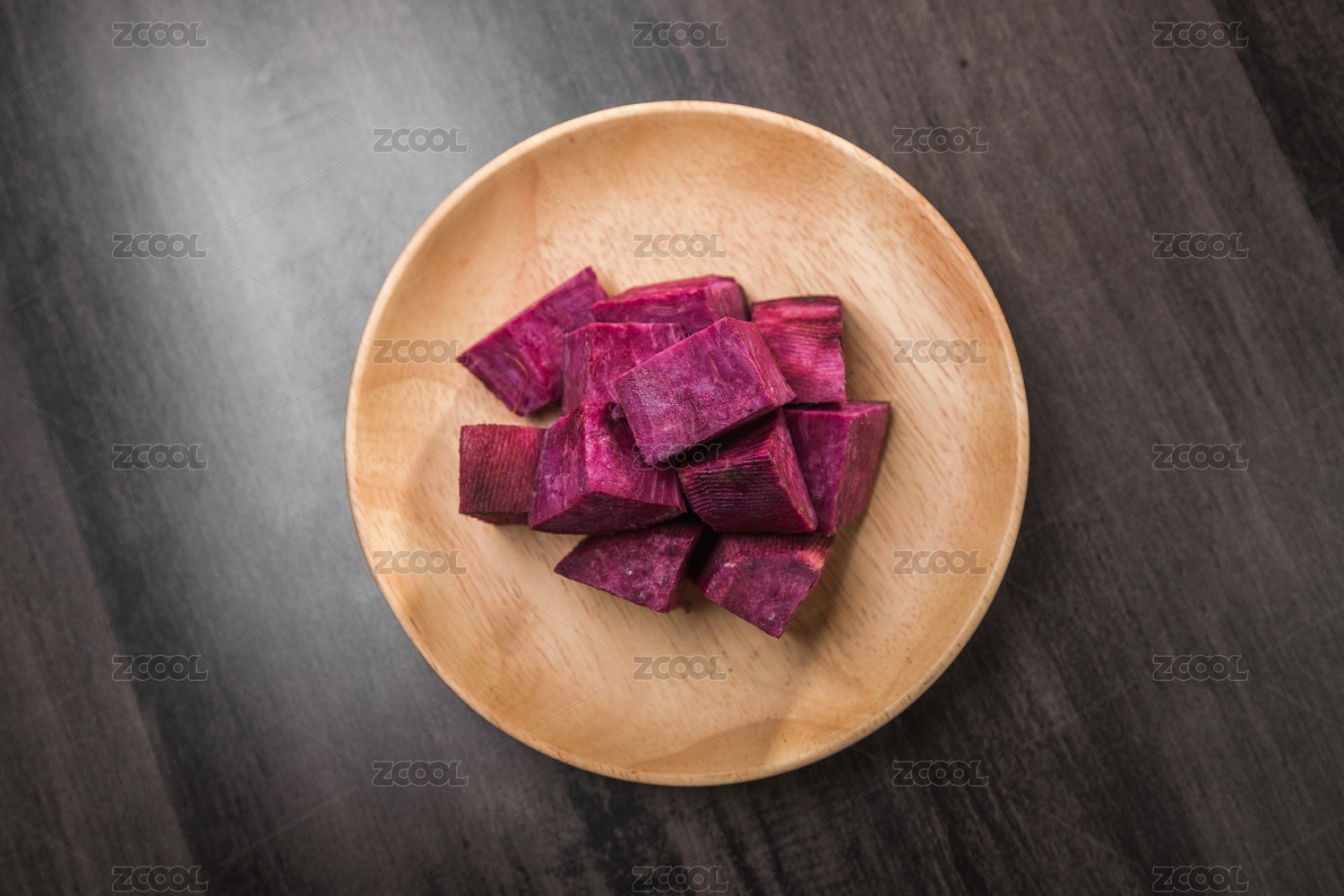 暗色木纹桌上放着一叠切成块的紫薯