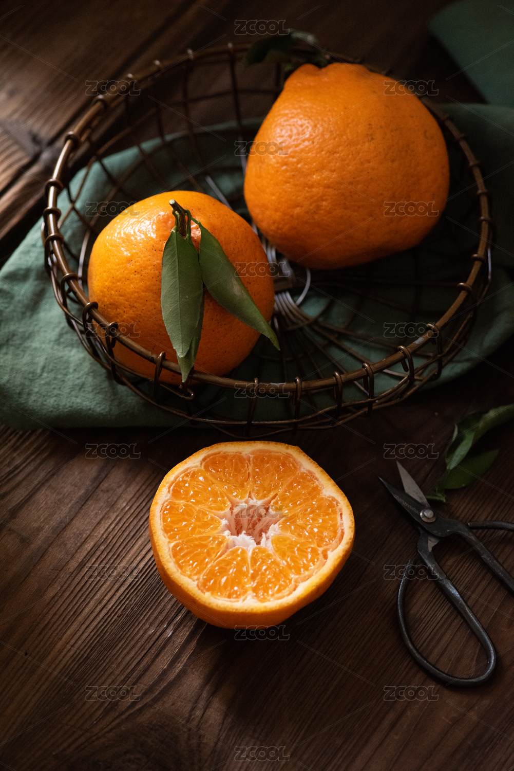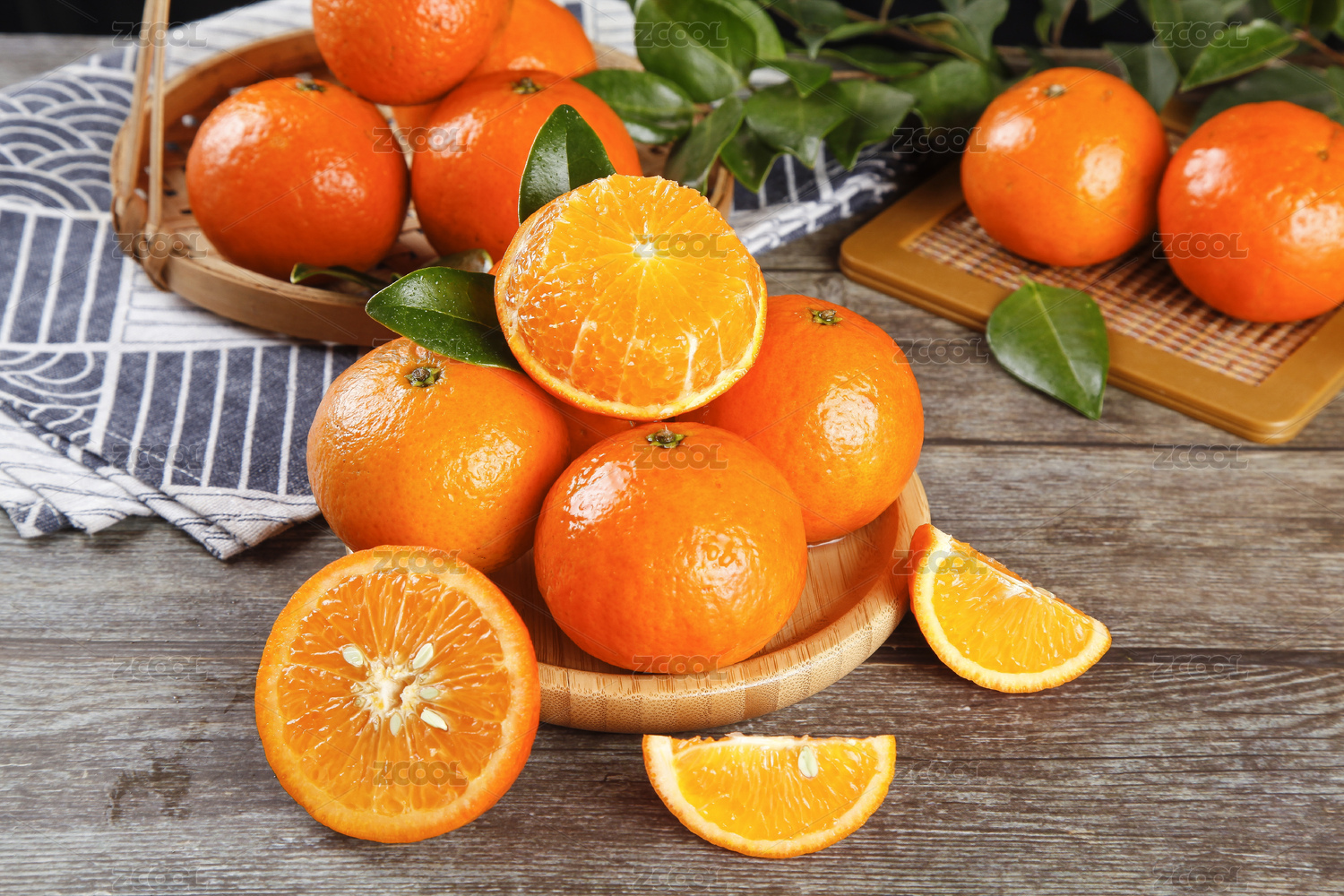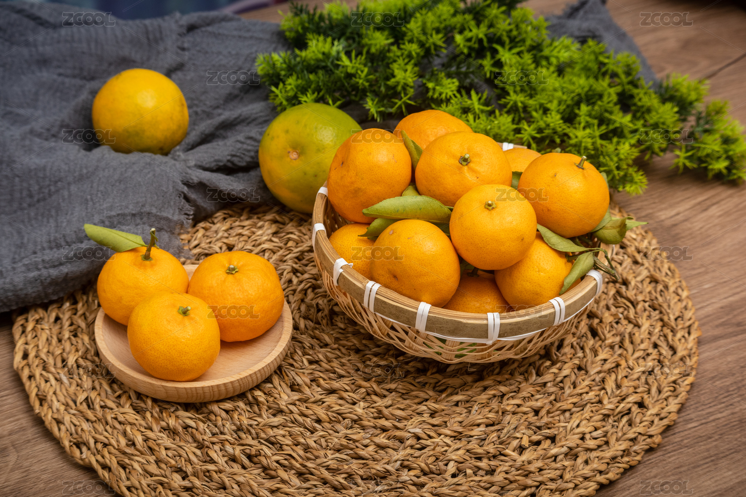 桌面摆放新鲜柑橘砂糖橘与绿叶编织垫静物