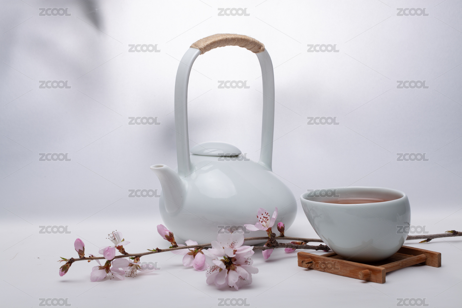 放在春日绿植里木桌上的白瓷茶壶和茶水