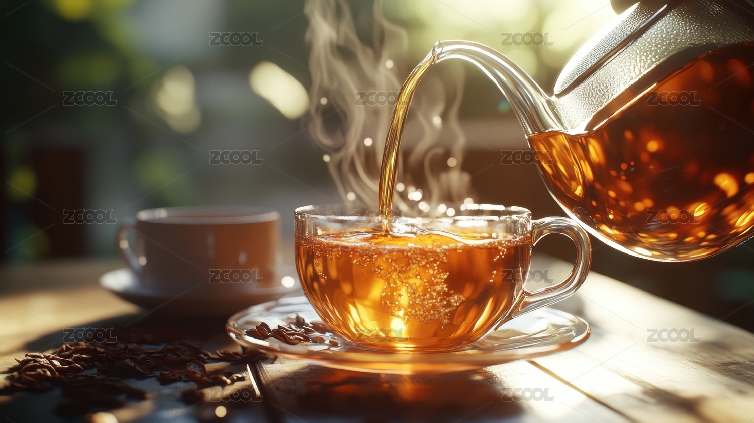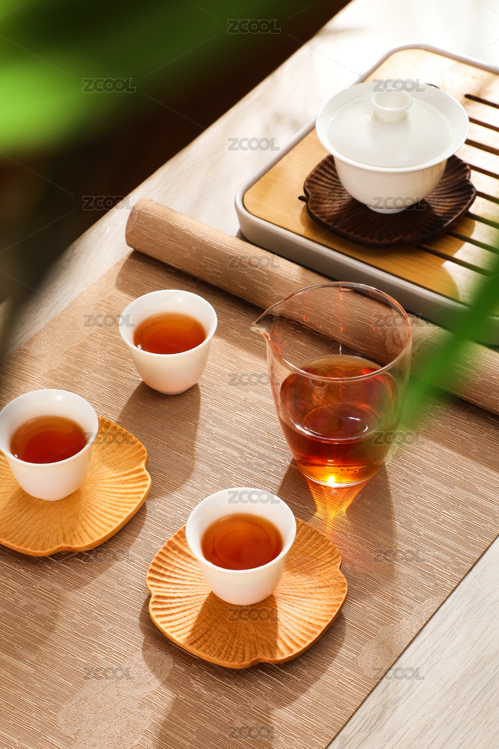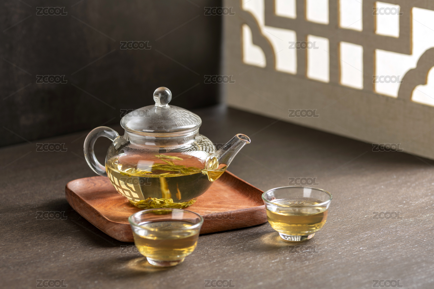 仿古玻璃茶壶冲泡的茶水摆放在窗棂影木桌面