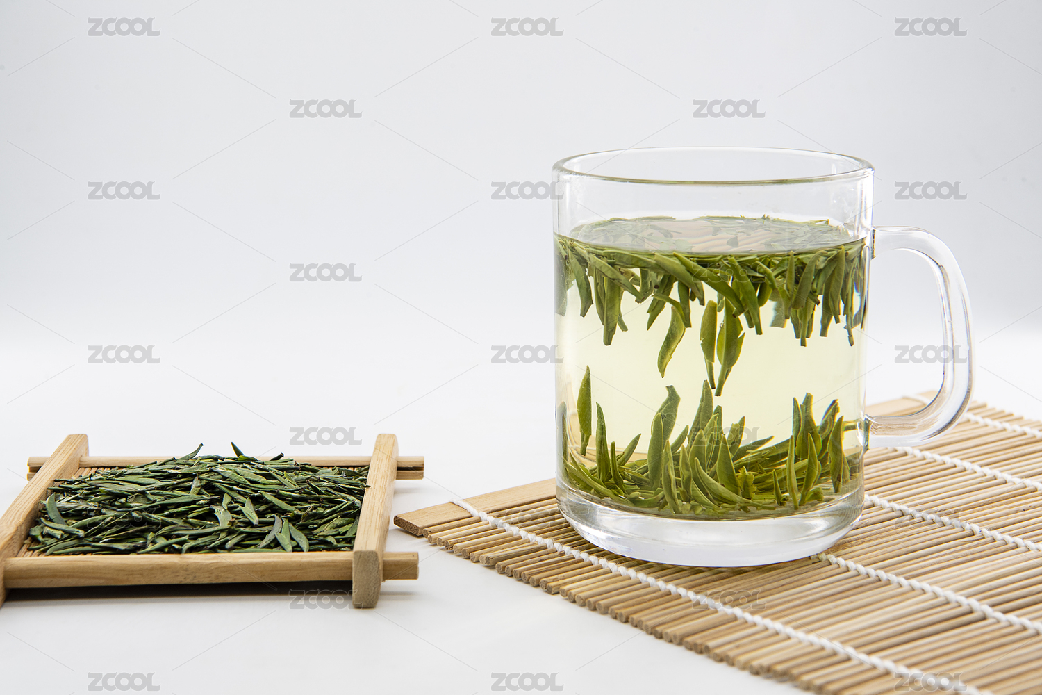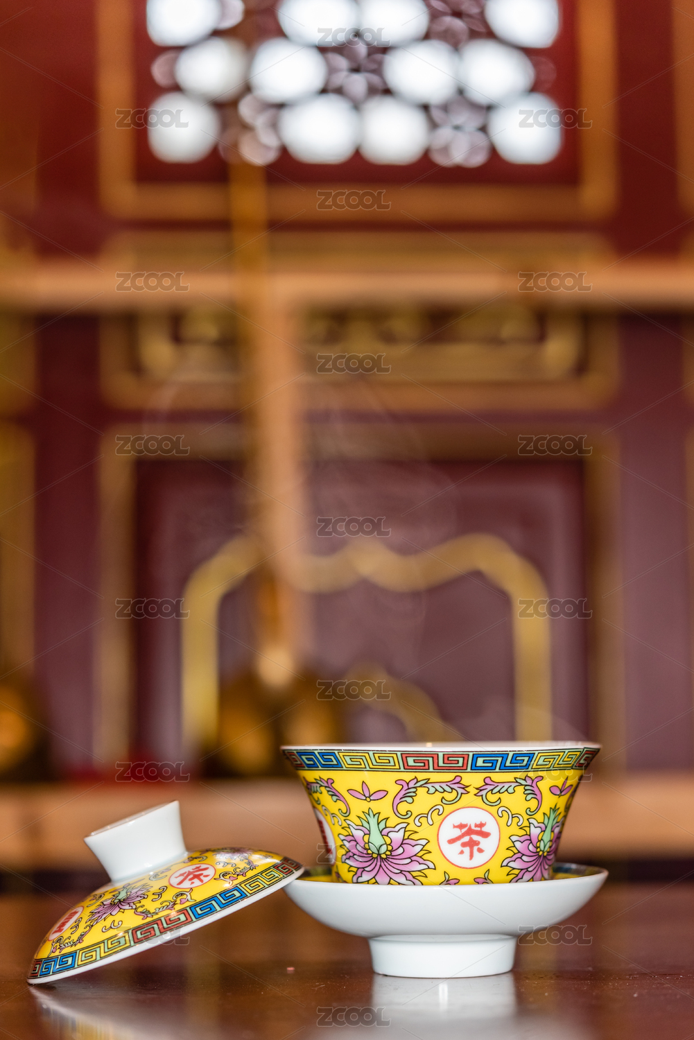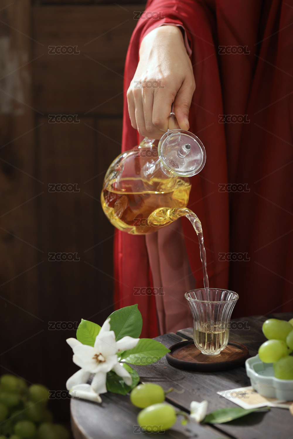 仿古玻璃茶壶冲泡的茶水摆放在窗棂影木桌面