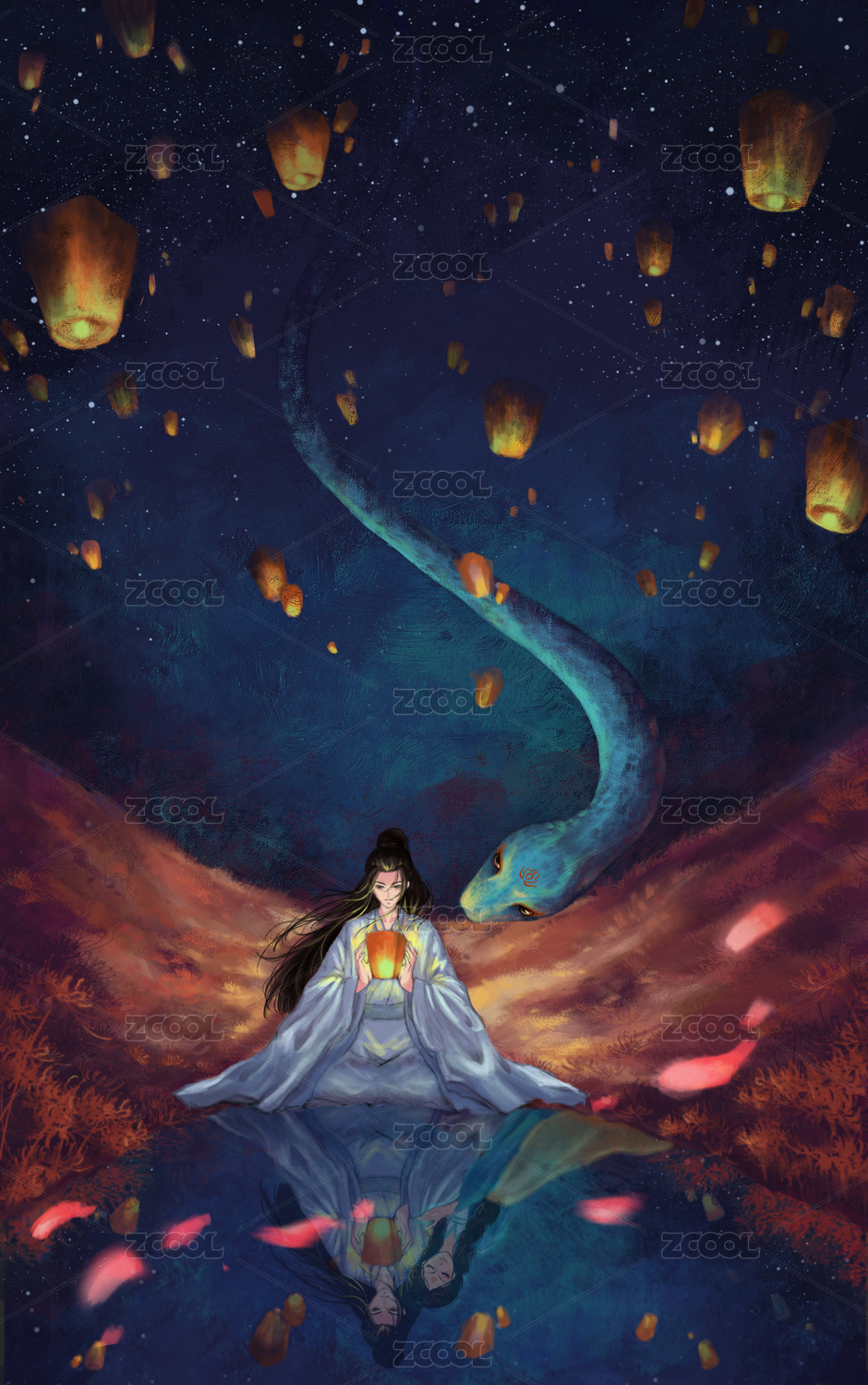 剪纸插画放天灯